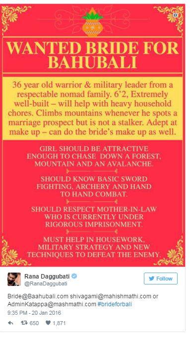 না ঘটনাটা মোটেই ফিল্মি নয়, বরং ১০০ শতাংশ সত্যি ৷ সেই ১৬ সাল থেকে বাহুবলির জন্য পাত্রী খুঁজছেন রানা ডগ্গুবতি ৷ আর সেই বিজ্ঞাপনটি আবার সোশ্যাল নেটওয়ার্কিংয়ে আবার হল ভাইরাল ৷