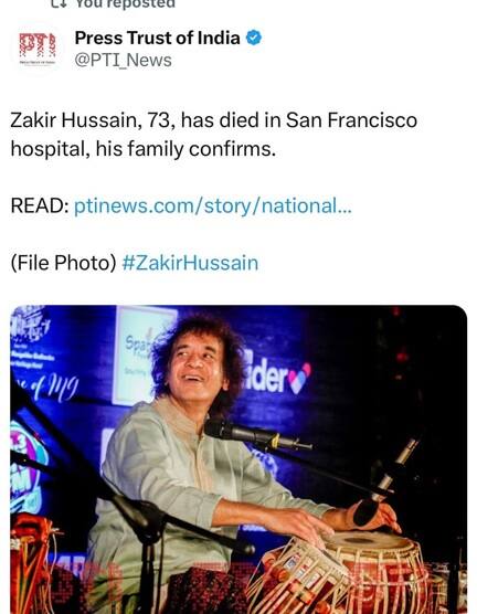 সংবাদসংস্থা পিটিআইয়ের খবর অনুযায়ী জাকির হুসেনের পরিবারের পক্ষ থেকেই তাঁর মৃত্যুর খবর জানানো হয়েছে ৷