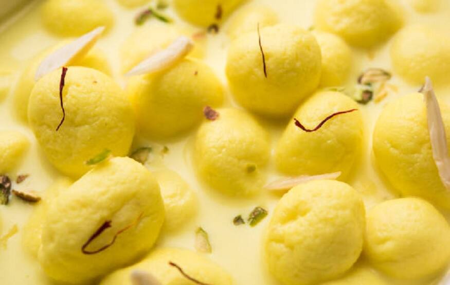 রসমালাই: একটা প্যানে দুধ ফোটাতে থাকুন৷ এর মধ্যে লেবুর রস দিয়ে ছানা কেটে নিন৷ পাতলা কাপড়ে মুড়ে ছানার জল ছেঁকে নিন৷ এবার ঠান্ডা জলে ছানা ধুয়ে অতিরিক্ত জল শুষে রাখুন৷ প্লেটে ঢেলে ৪-৫ মিনিট ধরে নরম করে ছানা মেখে নিন৷ ছানামাখায় আধ চা চামচ কর্নফ্লাওয়ার মিশিয়ে আরও ২ মিনিট ভাল করে মেখে নিন৷ একটা প্যানে জল গরম করে চিনি দিয়ে ফুটিয়ে রস তৈরি করুন৷ ছানা থেকে গোল গোল বল তৈরি করে রসে ফেলে ১০-১২ মিনিট চড়া আঁচে ফোটান৷