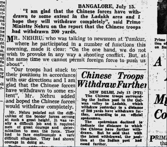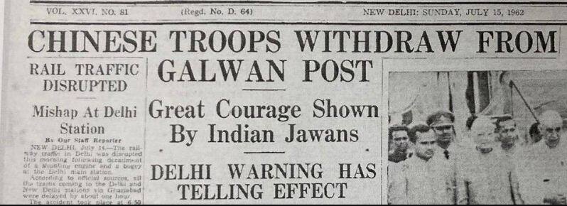#লাদাখ: প্রায় দু' মাস ধরে চলা সংঘাতের পরিস্থিতির পরে সোমবারই গালওয়ান উপত্যকায় পিছু হঠেছে চিনের সেনাবাহিনী৷ দুই বাহিনীর মধ্যে হওয়া বৈঠকের শর্ত মেনে পিছু হঠেছে ভারতীয় সেনাও৷ চিনা বাহিনী পিছু হঠার পরই ১৯৬২ সালের ভারতের একটি ইংরেজি সংবাদপত্রের শিরোনাম সোশ্যাল মিডিয়ায় ভাইরাল হয়েছে৷ ঘটনাচক্রে সেটিও ছিল জুলাই মাস৷ রবিবার ১৫ জুলাই, ১৯৬২ সালের সেই 'দ্য টাইমস অফ ইন্ডিয়া'-র সংবাদ শিরোনামে লেখা হয়েছিল, 'গালওয়ান পোস্ট থেকে বাহিনী প্রত্যাহার করল চিনা সেনা৷'