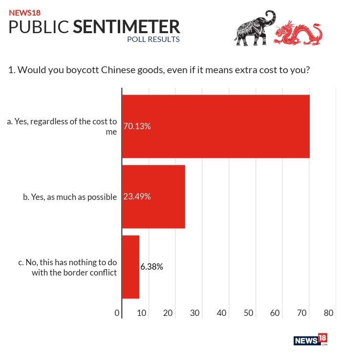 News18-এর পক্ষ থেকেও সম্প্রতি দেশজুড়ে একটি সমীক্ষা চালানো হয়েছিল ৷ তাতে দেখা যাচ্ছে, নিউজ১৮-এর বিভিন্ন ওয়েবসাইটে ভোট দেওয়া মানুষদের মধ্যে ৭০.১৩ শতাংশ মানুষ চিনা জিনিসের দাম যাই হোক না কেন, তা বর্জনের পক্ষে ৷ আরও ২৩.৪৯ শতাংশ মানুষ যতটা বেশি এবং তাড়াতাড়ি সম্ভব চিনা দ্রব্য বয়কটের পক্ষে ৷ মাত্র ৬.৩৮ শতাংশ মানুষই লাদাখে ভারত-চিন সীমান্তে যাই ঘটুক না কেন, চিনা জিনিস এখনই বর্জনের পক্ষে নন ৷