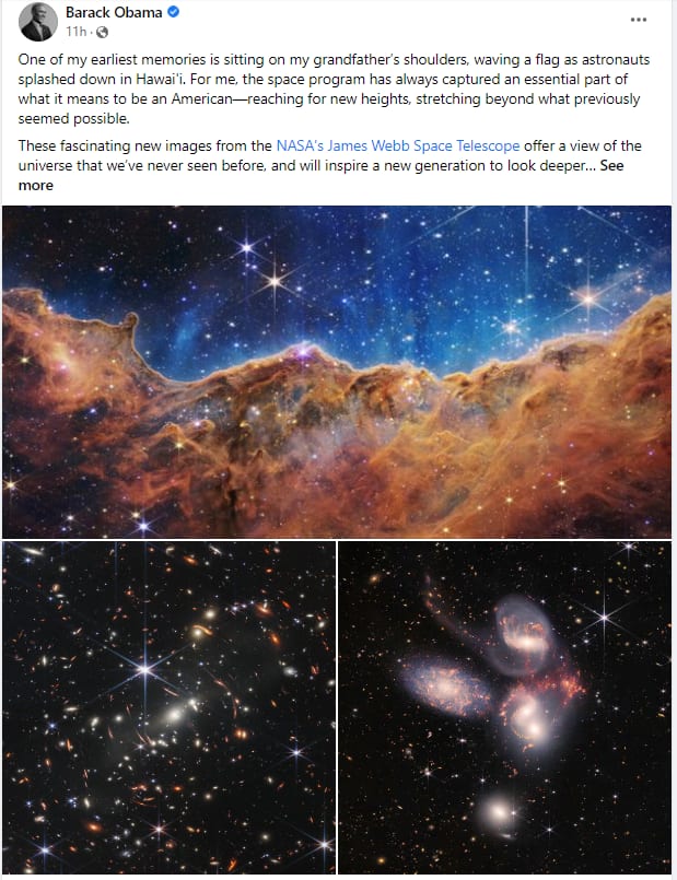 নাসা-র জেমস ওয়েব স্পেস টেলিস্কোপের পাঠানো মহাজাগতিক বেশ কিছু ছবিও শেয়ার করেছেন বারাক ওবামা ৷ প্রসঙ্গত অত্যাধুনিক ও শক্তিশালী এই টেলিস্কোপে ধরা পড়েছে নক্ষত্রপুঞ্জের নির্মাণপর্বের সমাহার ৷ তার পাঠানো এই ছবিগুলিকে বলা হচ্ছে এখনও অবধি ব্রহ্মাণ্ডের প্রাচীনতম প্রামাণ্য ছবি ৷