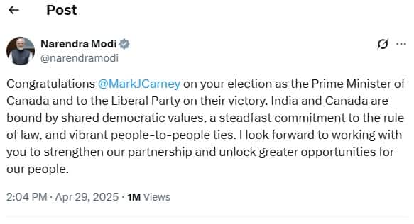 কার্নির জয়ের পর, প্রধানমন্ত্রী নরেন্দ্র মোদি তাঁকে এবং লিবারেল পার্টিকে অভিনন্দন জানান, একই সঙ্গে ভারত-কানাডা সম্পর্কের গুরুত্বের উপর জোর দেন। “ভারত এবং কানাডা অভিন্ন গণতান্ত্রিক মূল্যবোধ, আইনের শাসনের প্রতি দৃঢ় অঙ্গীকার এবং মানুষে মানুষে প্রাণবন্ত সম্পর্কের দ্বারা আবদ্ধ। আমাদের অংশীদারিত্বকে শক্তিশালী করতে এবং আমাদের জনগণের জন্য আরও বেশি সুযোগ তৈরি করতে আমি আপনার সাথে কাজ করার জন্য উন্মুখ,” X-এ প্রধানমন্ত্রী মোদী বলেন।