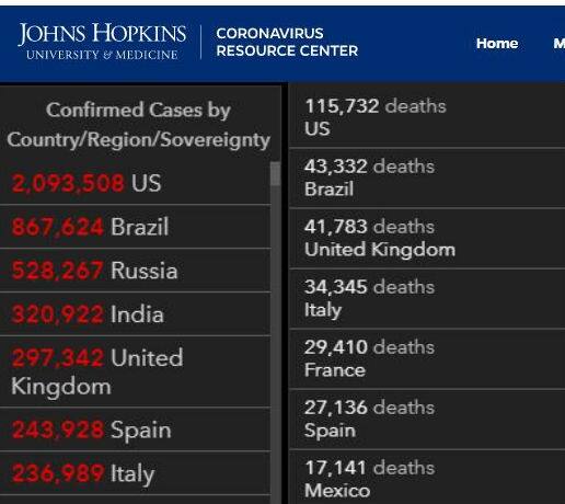 স্পেনে ২ লাখ ৪৩ হাজারের বেশি মানুষ আক্রান্ত, মৃতের সংখ্যা সেদেশে ২৭,৪১০ জনের। ইতালিতে মৃত্যু হয়েছে ৩৪ হাজার ৩৪৫ জনের। সেদেশে আক্রান্তের সংখ্যা ২ লক্ষ ৩৬ হাজারের বেশি। পেরুতে আক্রান্তের সংখ্যা ২ লক্ষ ২৯ হাজার ৭৩৬ জন আর মৃত্যু হয়েছে ৬ হাজার ৬৮৮ জনের। ফ্রান্সে আক্রান্তের সংখ্যা ১ লক্ষ ৯৪ জাহার ১৫৩ জন আর মৃত্যু হয়েছে ২৯ হাজার ৪১০ জনের। জার্মানিতে আক্রান্তের সংখ্যা ১ লক্ষ ৮৭ হাজারের বেশি, আর মৃতের সংখ্যা ৮ হাজার ৮০১ জনের।