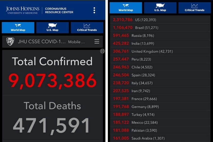 এখনও পর্যন্ত সবচেয়ে খারাপ অবস্থা আমেরিকার। সেখানে প্রতি মুহূর্তে লাফিয়ে বাড়ছে আক্রান্তের সংখ্যা। পাল্লা দিয়ে বাড়ছে মৃত্যুও। জন হপকিন্স বিশ্ববিদ্যালয়ের করোনা ভাইরাস ট্র্যাকার অনুযায়ী, সেখানে মৃত্যু হয়েছে ১ লক্ষ ২০ হাজার ৩৯৩ জনের। সে দেশে আক্রান্তের সংখ্যা গিয়ে দাঁড়িয়েছে ২৩ লক্ষ ১০ হাজার ৭৮৬ । আক্রান্তের নিরিখে আমেরিকার পরেই রয়েছে ব্রাজিল। সেখানে মোট আক্রান্তের সংখ্যা ১১ লক্ষ ৬ হাজার ৪৭০ জন, মৃত্যু হয়েছে ৫১ হাজার ২৭১ জনের। মৃতের নিরখেও দ্বিতীয় স্থানে রয়েছে ব্রাজিল। আক্রান্তের সংখ্যায় ব্রাজিলের পরেই রয়েছে রাশিয়া। সেখানে ৫ লক্ষ ৯১ হাজার ৪৬৫ মানুষ করোনায় আক্রান্ত, মৃত্যু হয়েছে ৮ হাজার ১৯৬ জনের। আক্রান্তের নিরিখে চার নম্বরে রয়েছে ভারত। এই মুহূর্তে দেশে করোনা আক্রান্তের সংখ্যা ৪ লক্ষ ২৫ হাজার ২৮২। মৃত্যু হয়েছে ১৩ হাজার ৬৯৯ জনের। মৃত্যুর নিরিখে তৃতীয় স্থানে রয়েছে ব্রিটেনে। ব্রিটেনে আক্রান্তের সংখ্যা ৩ লক্ষ ৬ হাজার ৭৬১। মৃত্যু হয়েছে ৪২,৭৩১ জনের।