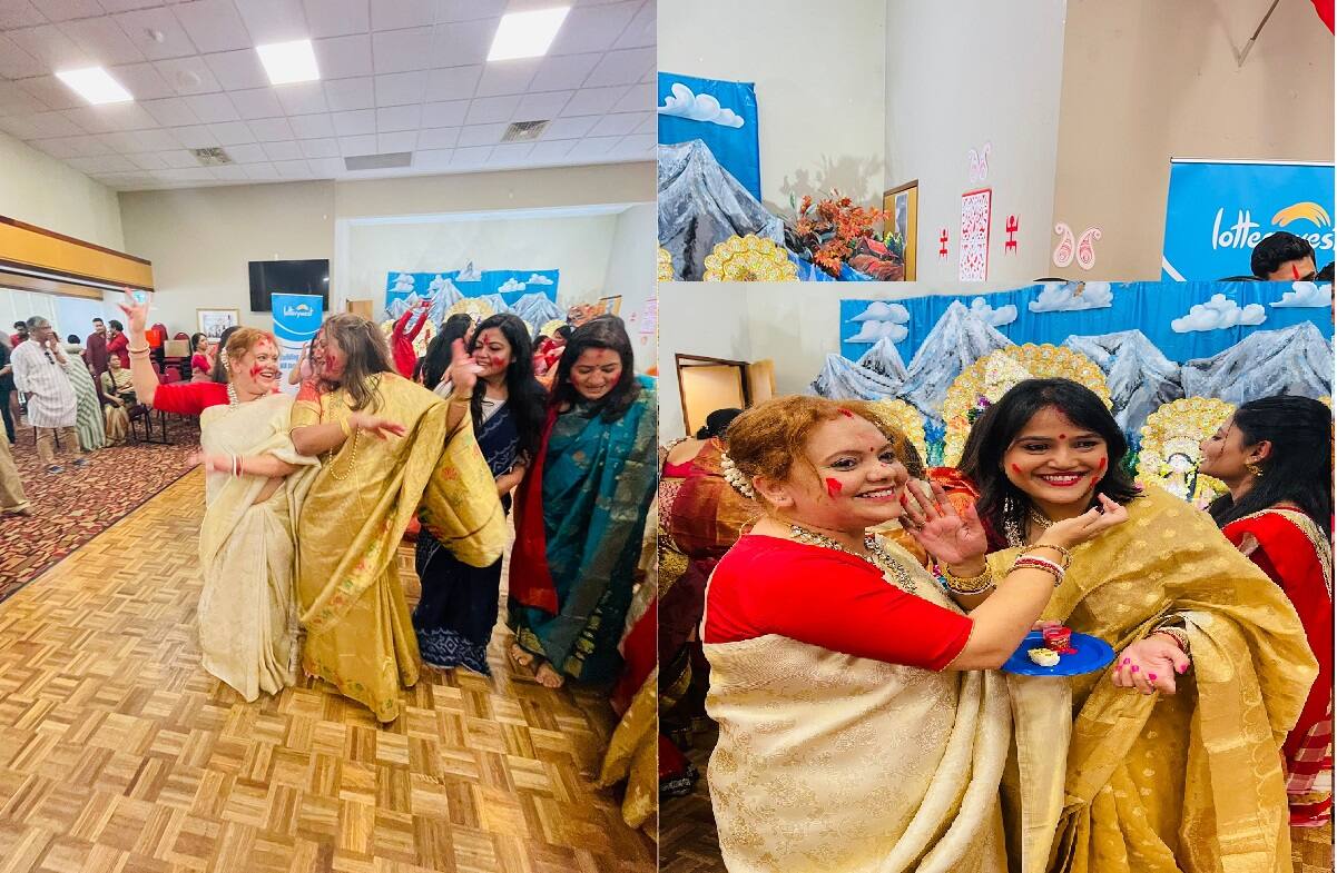 আমাদের এখানে আমেরিকার মত নামজাদা বাঙালি শিল্পীরা আসেন না প্রোগ্রাম করতে। বরং কয়েকমাস ধরে আমাদের নিজেদের মধ্যেই রিহার্সাল চলে পুজোর ‘সাংস্কৃতিক সন্ধ্যা’র আয়োজনে। ঠিক যেমন পাড়ার পুজোর প্যান্ডেলে হয়, খানিকটা তেমন। সেখানে নামজাদা শিল্পীর চাকচিক্য না থাকতে পারে, কিন্তু থাকে পাড়ার মুখচেনা ছেলে বা মেয়েটার হঠাৎ একদিনের শিল্পী হওয়ার গল্প। এখানে ধুনুচি নাচ হয় কিন্তু আগুন ছাড়া (ফায়ার আলার্ম বেজে যাবে যে)। সন্ধিপুজোর আরতি ইলেকট্রিক টুনি দিয়ে সারতে হয়। এখানে আমাদের ঢাকি আসে না, তবে ঢাক আছে। সেখানে তালে তালে নিজেরাই নিজেদের মত বাজানো ‘ঠাকুর থাকবে কতক্ষণ, ঠাকুর যাবে বিসর্জন’। সিঁদুর খেলায় মাতেন সকলে। এখানে ভাসান হয় না মূর্তির। দশমীর পরে একটা কার্টনে করে মূর্তি তুলে রেখে দেওয়া হয়, পরের বছরের জন্য।