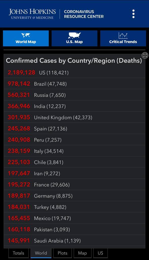 এখনও পর্যন্ত সবচেয়ে খারাপ অবস্থা আমেরিকার। সেখানে প্রতি মুহূর্তে লাফিয়ে বাড়ছে আক্রান্তের সংখ্যা। পাল্লা দিয়ে বাড়ছে মৃত্যুও। জনস হপকিন্স বিশ্ববিদ্যালয়ের করোনা ভাইরাস ট্র্যাকার অনুযায়ী, সেখানে মৃত্যু হয়েছে ১ লক্ষ ১৮ হাজার ১২৮ জনের। সে দেশে আক্রান্তের সংখ্যা গিয়ে দাঁড়িয়েছে ২১ লক্ষ ৮৯ হাজার ১২৩ । আক্রান্তের নিরিখে আমেরিকার পরেই রয়েছে ব্রাজিল। সেখানে মোট আক্রান্তের সংখ্যা ৯ লক্ষ ৭৮ হাজার ১৪২ জন, মৃত্যু হয়েছে ৪৭ হাজার ৭৪৮ জনের। মৃতের নিরখেও দ্বিতীয় স্থানে রয়েছে ব্রাজিল। আক্রান্তের সংখ্যায় ব্রাজিলের পরেই রয়েছে রাশিয়া। সেখানে ৫ লক্ষ ৬০ হাজার ৩২১ মানুষ করোনায় আক্রান্ত, মৃত্যু হয়েছে ৭ হাজার ৬৫০ জনের। মৃত্যুর নিরিখে খারাপ পরিস্থিতি ব্রিটেনেও। ব্রিটেনে আক্রান্তের সংখ্যা ৩ লক্ষ ছাপিয়ে গিয়েছে। মৃত্যু হয়েছে ৪২,৩৭৩ জনের। আক্রান্তের নিরিখে চার নম্বরে রয়েছে ভারত। এই মুহূর্তে দেশে করোনা আক্রান্তের সংখ্যা ৩ লক্ষ ৬৬ হাজার ৯৪৬। মৃত্যু হয়েছে ১২ হাজার ২৩৭ জনের।