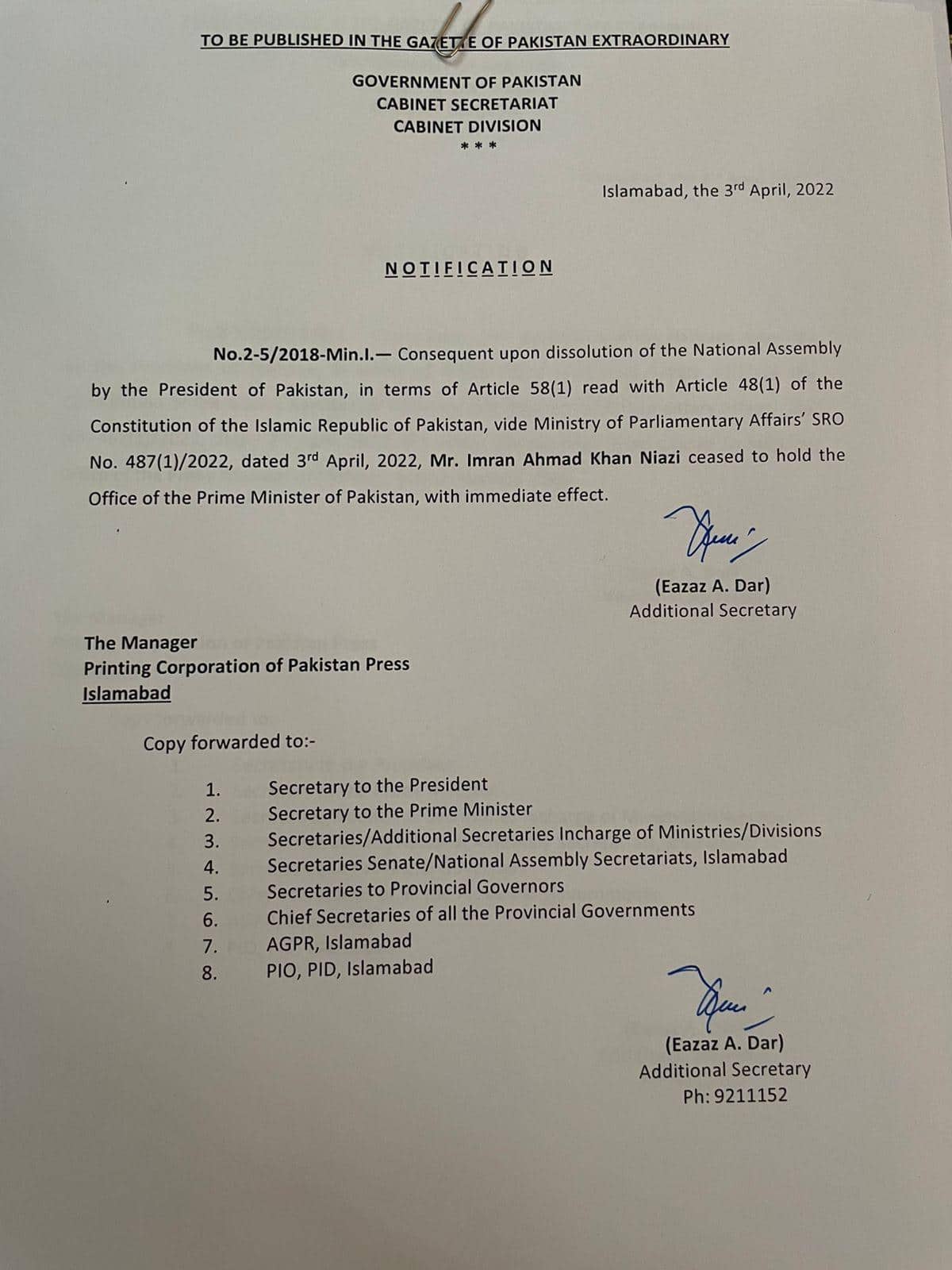 বিজ্ঞপ্তিতে স্পষ্ট বলা হয়েছে ইমরান খান আর প্রধানমন্ত্রী নন।বিধানসভা বিশৃঙ্খলার পরে সর্বশেষ এই বিজ্ঞপ্তিতে (Imran Khan) পাকিস্তান সরকার বলেছে, পাকিস্তানের রাষ্ট্রপতি জাতীয় পরিষদ ভেঙে দিয়েছেন। একই সঙ্গে ইমরান খানের বিরুদ্ধে অনাস্থা প্রস্তাব খারিজ করে দেন জাতীয় পরিষদের ডেপুটি স্পিকার।