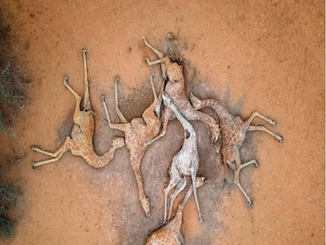 নয়াদিল্লি : ছ’টি নিথর জিরাফ৷ শুকনো ফুটিফাটা প্রান্তরে তারা চিরঘুমে৷ মৃত্যুতেও ছাড়েনি একে অন্যের সঙ্গ৷ একটা দেহ জড়িয়ে আছে অন্য দেহগুলির সঙ্গে৷ চিত্রসাংবাদিক Ed Ram-এর তোলা এরিয়াল শটে ধরা পড়েছে খরাবিধ্বস্ত কেনিয়ার বীভৎস ছবি (Drought stricken Kenya)৷ মানুষের সঙ্গে পশুপ্রাণীরাও সেখানে মরিয়া একফোঁটা জলের সন্ধানে (Kenya drought takes lives of Giraffes)৷