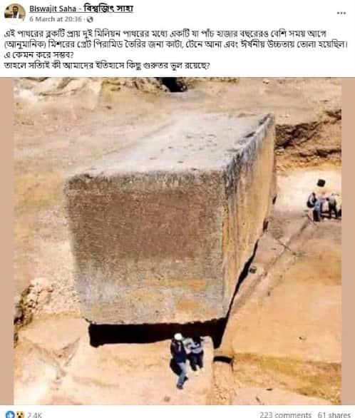 কেউ কেউ এই ছবিটি শেয়ার করে লিখছেন, “এই পাথরের ব্লকটি প্রায় দুই মিলিয়ন পাথরের মধ্যে একটি যা পাঁচ হাজার বছরেরও বেশি সময় আগে (আনুমানিক) মিশরের গ্রেট পিরামিড তৈরির জন্য কাটা, টেনে আনা এবং ঈর্ষনীয় উচ্চতায় তোলা হয়েছিল। এ কেমন করে সম্ভব? তাহলে সত্যিই কী আমাদের ইতিহাসে কিছু গুরুতর ভুল রয়েছে?”
