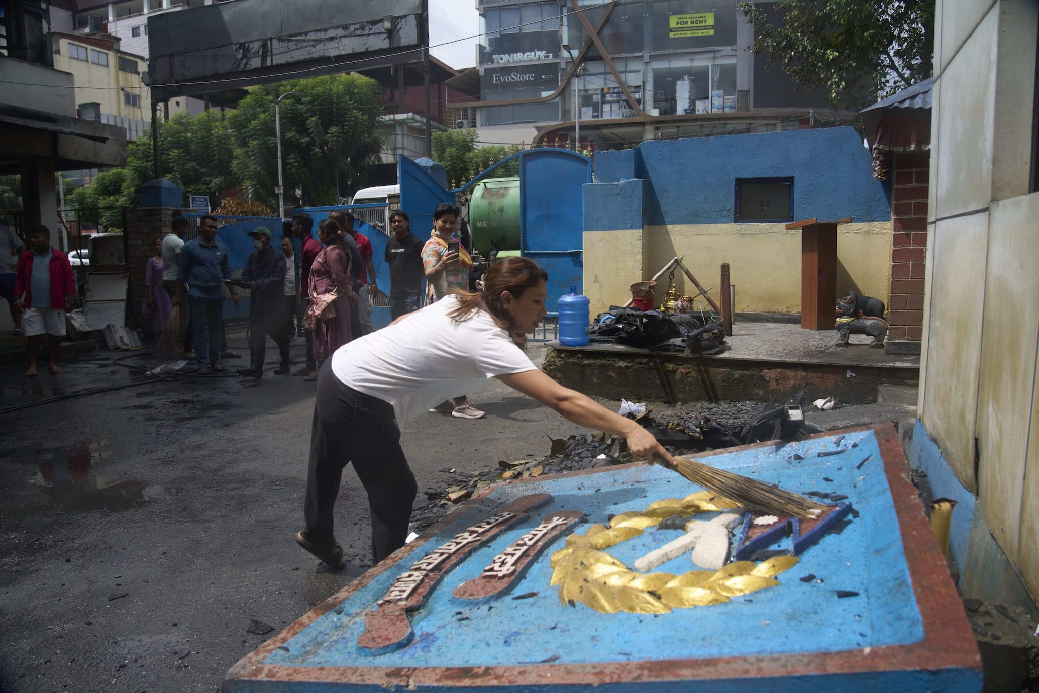 A volunteer cleans a police station which was vandalized during anti-corruption protests sparked by a short-lived social media ban in Kathmandu, Nepal, Saturday, Sept. 13, 2025. (AP Photo/Niranjan Shrestha)
