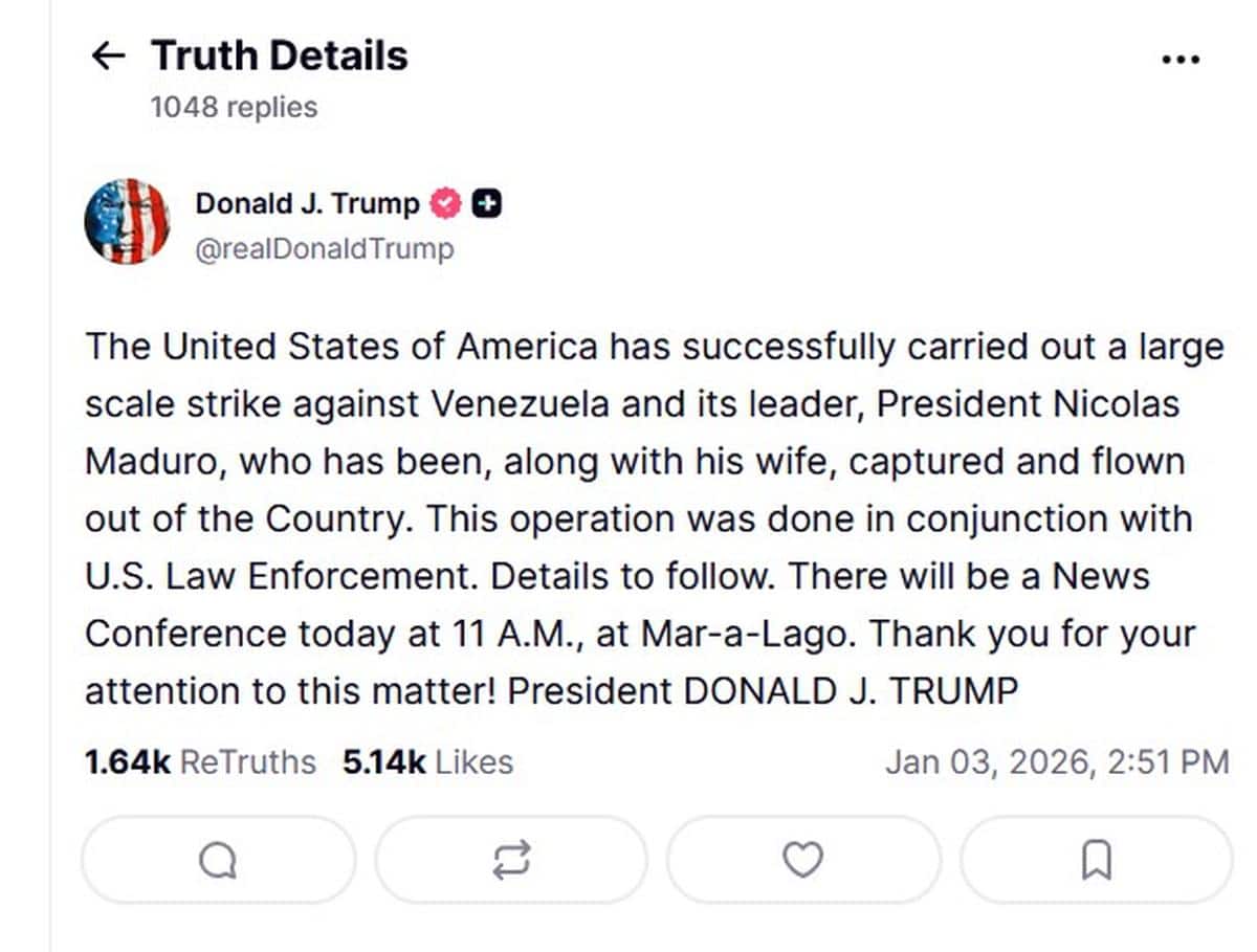 এই ঘটনার মাঝেই নিজের এক্স হ্যান্ডলে বিস্ফোরক একটি পোস্ট করেছেন মার্কিন প্রেসিডেন্ট ডোনাল্ড ট্রাম্প। তিনি নিজের এক্স হ্যান্ডল ট্রুথ সোশ্যালে লিখেছেন, “মার্কিন যুক্তরাষ্ট্রের পক্ষ থেকে বড় হামলা চালানো হয়েছে। এর ফলে ভেনেজুয়েলার প্রেসিডেন্ট নিকোলাস মাদুরো এবং তাঁর স্ত্রীকে হেফাজতে নিয়েছে মার্কিন সেনাবাহিনী। এরপরেই তাঁদের হেফাজতে নেওয়ার পর দেশ থেকে বের করে আনা হয়েছে।”