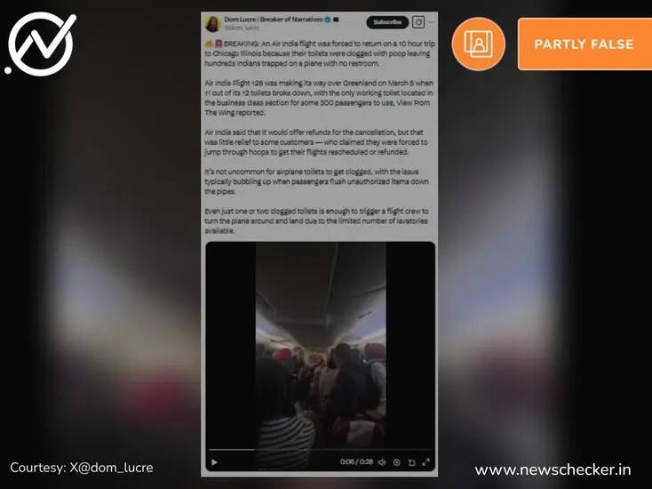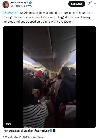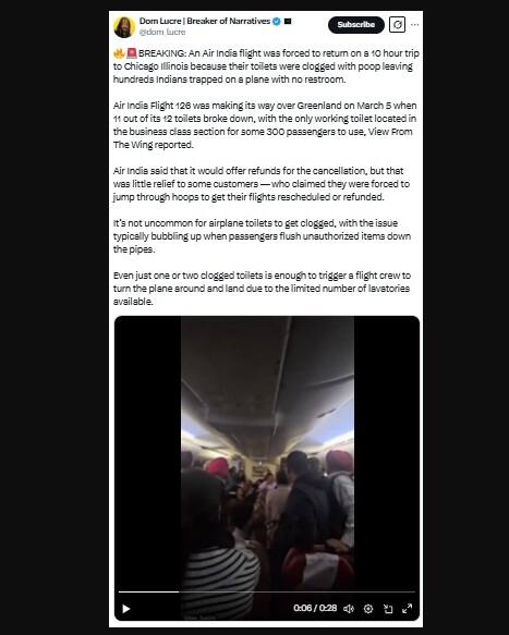 ২৮ সেকেন্ডের একটি ভিডিও, যেখানে যাত্রীদের বিমানের ভেতরে দেখানো হয়েছে, সোশ্যাল মিডিয়ায় ভাইরাল হয়েছে, দাবি করা হচ্ছে যে এটি দিল্লিগামী এয়ার ইন্ডিয়ার একটি বিমানের ভিডিও, যা ৬ মার্চ শিকাগোতে ফেরত পাঠানো হয়েছিল বলে অভিযোগ করা হচ্ছে। টয়লেট বন্ধ থাকার কারণে এই বিমানটি বাতিল করা হয়েছিল।