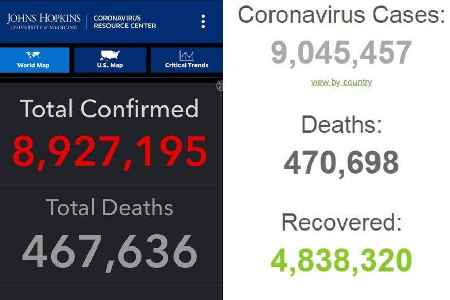 জনস হপকিন্স বিশ্ববিদ্যালয়ের করোনা ভাইরাস ট্র্যাকার অনুযায়ী, এই মুহূর্তে মোট আক্রান্তের সংখ্যা ৮৯ লক্ষ ২৭ হাজার ১৯৫। শেষ পাওয়া খবরে বিশ্বে মৃত্যুর সংখ্যা বেড়ে দাঁড়িয়েছে ৪ লক্ষ ৫৭ হাজার ৬৩৬। তবে, সুস্থ হয়ে বাড়ি ফিরেছেন ৪৮ লক্ষ ৩৮ হাজার ৩২০ জন। আর ওয়ার্ল্ডমিটারস কোভিড ট্র্যাকার অনুযায়ী, বিশ্বে মোট আক্রান্তের সংখ্যা ৯০ লক্ষ ছাড়িয়েছে। বিশ্বে করিনা আক্রান্তের সংখ্যা গিয়ে এখন দাঁড়িয়েছে ৯০ লক্ষ ৪৫ হাজার ৪৫৭, সেই সঙ্গে মৃতের সংখ্যা গিয়ে দাঁড়িয়েছে ৪ লক্ষ ৭০ হাজার ৬৯৮ জন।