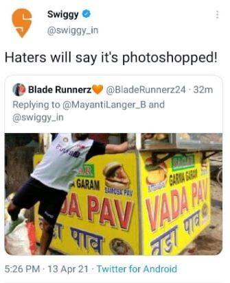 ম্যাচের আগে একজন ইউজার রোহিতের একটি এডিট হওয়া ছবি সোশ্যাল মিডিয়ায় শেয়ার করেন৷ সেখানে দেখা যায় রোহিত বড়াপাও ধরার জন্য লাফাচ্ছেন৷ এই ছবিটাকে রি ট্যুইট করে সুইগি আবার কমেন্ট করে৷