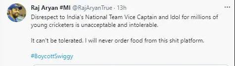 এরই মধ্যে অনলাইন ফুড ডেলিভারি অ্যাপ সুইগি (Swiggy) ফ্যানেদের নিশানায় এসেছে৷ Swiggyআসলে ম্যাচ শুরুর আগে মুম্বই ইন্ডিয়ান্সের অধিনায়ক রোহিত শর্মাকে নিয়ে কমেন্ট করেছিল৷ তাদের এই কাণ্ডের জেরে বয়কট সুইগি (BoycottSwiggy) ট্রেন্ড করতে শুরু করে৷