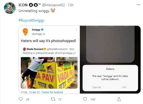এরপর নাছোড় ফ্যানরা সেই ডিলিট হওয়া ট্যুইটের স্ক্রিন শট দিয়েও ট্যুইট জারি রাখেন৷ কিছু কিছু গ্রাহক আবার নিজেদের ফোন থেকে সুইগি আনইনস্টল করে দেন৷ আবার সেই আনইনস্টল করার ছবির স্ক্রিনশটও সোশ্যাল হ্যান্ডেলে দিয়ে দেন৷