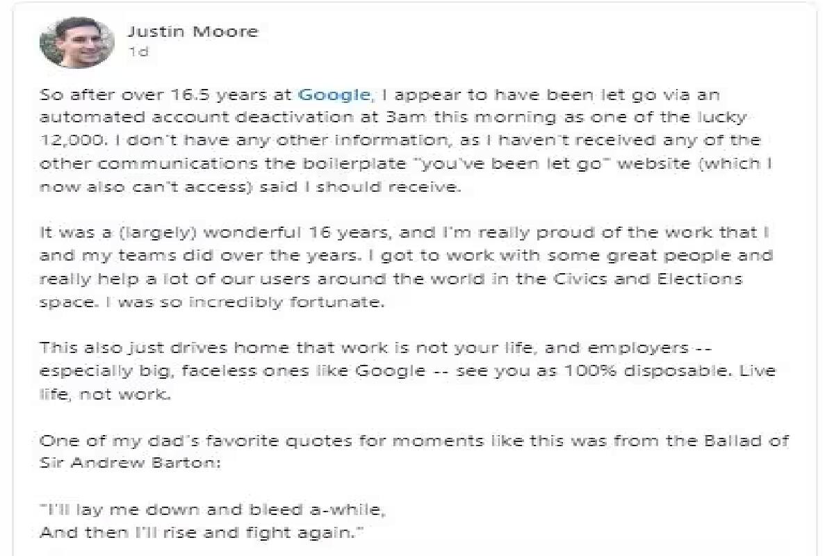 গুগল-এ প্রায় সাড়ে ১৬ বছর কাজ করার পরে এমনই ই-মেল পেয়েছেন জাস্টিন মুর নামে ওই ব্যক্তি। চাকরি হারানোর ভয়াবহ অমানবিক সেই অভিজ্ঞতার কথা নিজের লিঙ্কড ইন প্রোফাইলে শেয়ার করেছেন তিনি।