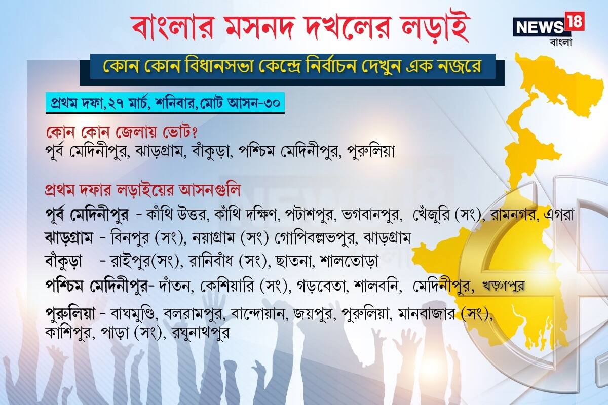 শনিবার ভোটের ঘণ্টা বাজতেই প্রথম যুদ্ধে নামবে রাজ্যের পাঁচটা জেলা। এর মধ্যে রয়েছে পূর্ব মেদিনীপুর, ঝাড়গ্রাম, বাঁকুড়া, পশ্চিম মেদিনীপুর, পুরুলিয়া। দেখে নেওয়া যাক কোন কোন বিধানসভা কেন্দ্রে এই দিন নির্বাচন অনুষ্ঠিত হবে-