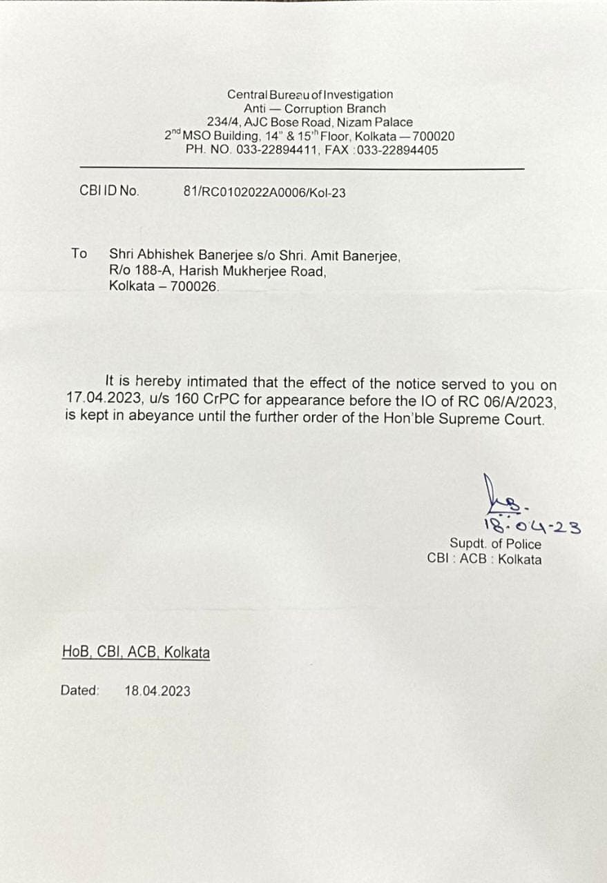 সুপ্রিম কোর্টের স্থগিতাদেশ সত্ত্বেও সিবিআইয়ের নোটিস পাঠানো নিয়ে সোমবার বিকেলে ট্যুইটারে অভিযোগ করেছিলেন তৃণমূলের সর্বভারতীয় সাধারণ সম্পাদক অভিষেক বন্দ্যোপাধ্যায়। ২৪ ঘণ্টার মধ্যেই সিবিআই এই চিঠি পাঠাল অভিষেক বন্দ্যোপাধ্যায়কে। এখন দেখার এই চিঠির বয়ানের ভিত্তিতে অভিষেক বন্দ্যোপাধ্যায় কি আদালত অবমাননার অভিযোগ জানিয়ে উচ্চ আদালতের দ্বারস্থ হবেন?