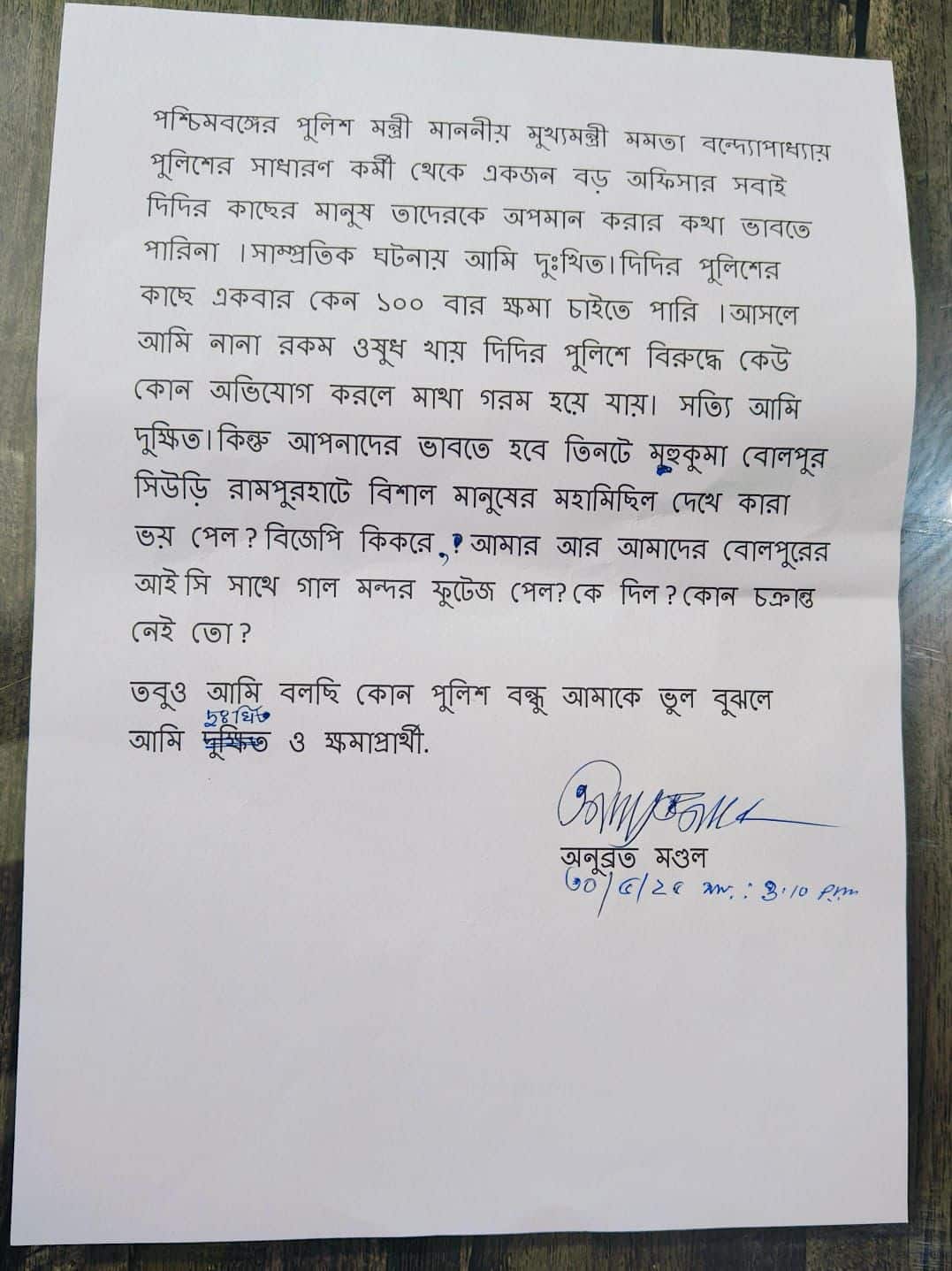অনুব্রত চিঠিতে লিখেছেন, ‘পশ্চিমবঙ্গের পুলিশমন্ত্রী মাননীয় মুখ্যমন্ত্রী মমতা বন্দ্যোপাধ্যায়ের পুলিশের সাধারণ কর্মী থেকে একজন বড় অফিসার সবাই দিদির কাছের মানুষ তাদেরকে অপমান করার কথা ভাবতে পারি না৷ সাম্প্রতিক ঘটনায় আমি দুঃখিত৷ দিদির পুলিশের কাছে একবার কেন ১০০ বার ক্ষমা চাইতে পারি৷ আসলে আমি নানা ওষুধ খাই দিদির পুলিশের বিরুদ্ধে কেউ কোন অভিযোগ করলে মাথা গরম হয়ে যায়৷ সত্যি আমি দুঃখিত৷ কিন্তু আপনাদের ভাবতে হবে তিনটে মহকুমা বোলপুর সিউড়ি রামপুরহাট বিশাল মানুষের মহামিছিল দেখে কারা ভয় পেল? বিজেপি কী করে আমার আর আমাদের বোলপুরের আইসির সাথে গালমন্দর ফুটেজ পেল? কে দিল? কোনও চক্রান্ত নেই তো? তবুও আমি বলছি কোন পুলিশ বন্ধু আমাকে ভুল বুঝলে আমি দুঃখিত ও ক্ষমাপ্রার্থী৷’