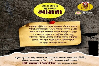 আর মাত্র দু-মাস। তারপরেই পুজো। কলকাতা সাজতে শুরু করেছে ইতিমধ্য়েই। বড়বড় ক্লাবগুলির উত্তেজনাও তুঙ্গে। উদয়ন সংঘের যে পোস্টার পড়েছে সেখানে উল্লেখ করা হয়েছে, দূষণমুক্ত পরিবেশের লক্ষ্যে নাকতলার উদয়নে থাকব আমরা এলাকাবাসী। ২৭ অগাস্ট সকাল ১১টায় আরম্ভ আমাদের আগমনীর প্রচার। এলাকার ৮ থেকে ৮০ সকলের ভাবনায় রং তুলিতে রঙিন হবে ক্যানভাস। বাংলার ঐতিহ্য বাঙালির আবেগ দুর্গাপুজো দেখবে এক নতুন সূর্যর ভোর। নাকতলাবাসীর পক্ষ থেকে সকলকে আমন্ত্রণ। পোস্টার ইতিমধ্যেই নজর কাড়তে শুরু করেছে রাজনৈতিক মহলেও।