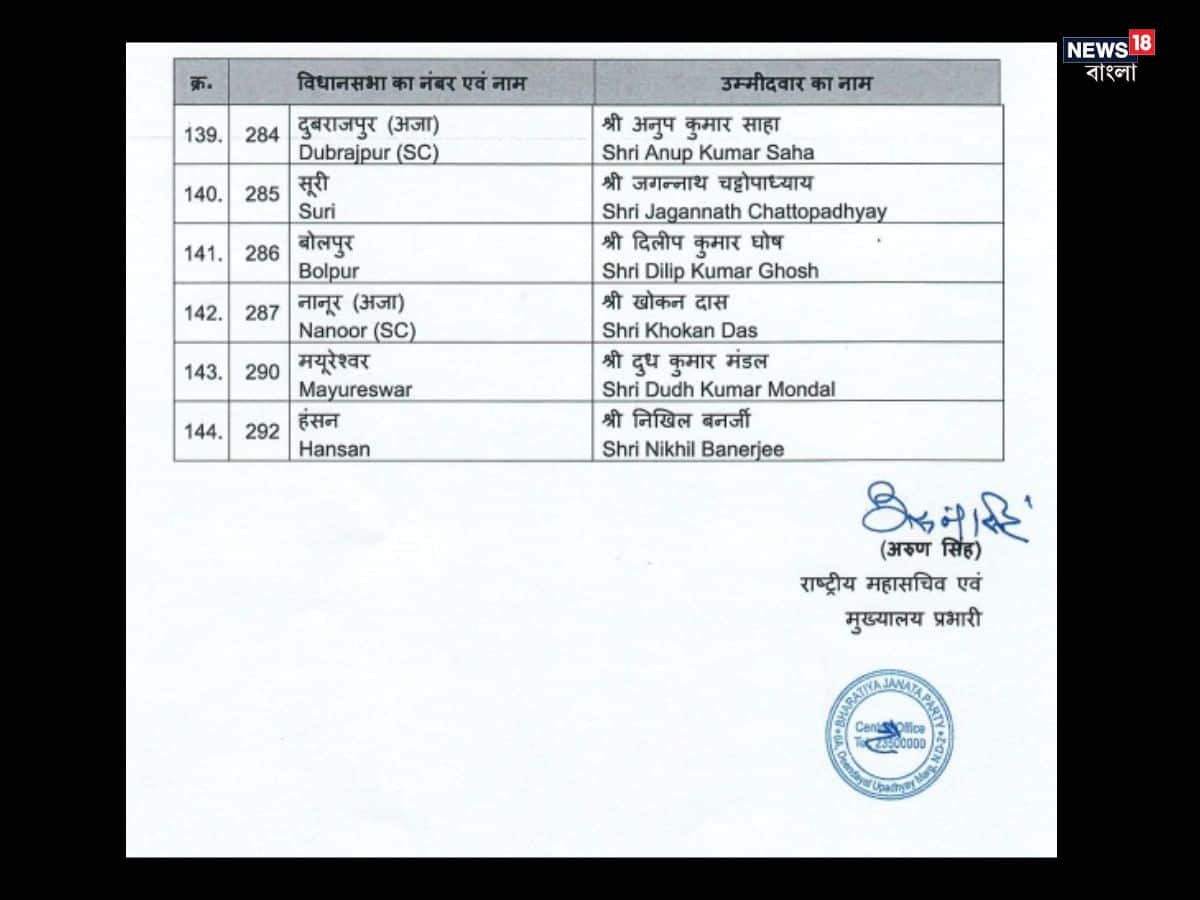 এছাড়া দিলীপ ঘোষ-কে প্রার্থী করা হয়েছে খড়্গপুর সদর কেন্দ্র থেকে। বরানগর আসনে বিজেপির প্রার্থী করা হয়েছে সজল ঘোষকে। অন্যদিকে, ভাটপাড়া কেন্দ্রে প্রার্থী করা হয়েছে সাংসদ অর্জুন সিং-এর ছেলে পবন সিংকে। আর শিবপুর কেন্দ্র থেকে প্রার্থী করা হয়েছে অভিনেতা-রাজনীতিবিদ রুদ্রনীল ঘোষ-কে।