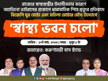 পদ্ম শিবিরের এদিনের কর্মসূচিতে বিজেপির মহিলা মোর্চার রাজ্য সভানেত্রী তনুজা চক্রবর্তীর নেতৃত্বে মহিলা মোর্চার কর্মী-সমর্থকরাও অংশ নেবেন বলে বিজেপি সূত্রের খবর। প্রসঙ্গত, অ্যাডিনোভাইরাসের শিকার হয়ে একের পর এক শিশু মৃত্যুর ঘটনায় উদ্বিগ্ন রাজ্য বিজেপি। বিজেপির দাবি, ‘‘শিশু মৃত্যু ঠেকাতে রাজ্যের এই মুহূর্তে উপযুক্ত পরিকাঠামো নেই।’’ যুব মোর্চা নেতৃত্বের আরও অভিযোগ, ‘‘শিশু মৃত্যু নিয়ে প্রকৃত তথ্য গোপন করা হচ্ছে। এই মুহূর্তে রাজ্যের শিশুদের চিকিৎসা ব্যবস্থা কার্যত ভেঙে পড়েছে। সরকারি হাসপাতালে বেডের আকাল। যেভাবে শিশু মৃত্যু নিয়ে অসত্য তথ্য সরবরাহ করছে স্বাস্থ্য দফতর, তা এককথায় নিন্দার। আমরা বিষয়টি কেন্দ্রীয় সরকার এবং আমাদের সর্বোচ্চ নেতৃত্বকে জানিয়েছি যে রাজ্য সরকার পশ্চিমবঙ্গের শিশু মৃত্যু ঠেকাতে ব্যর্থ।’’