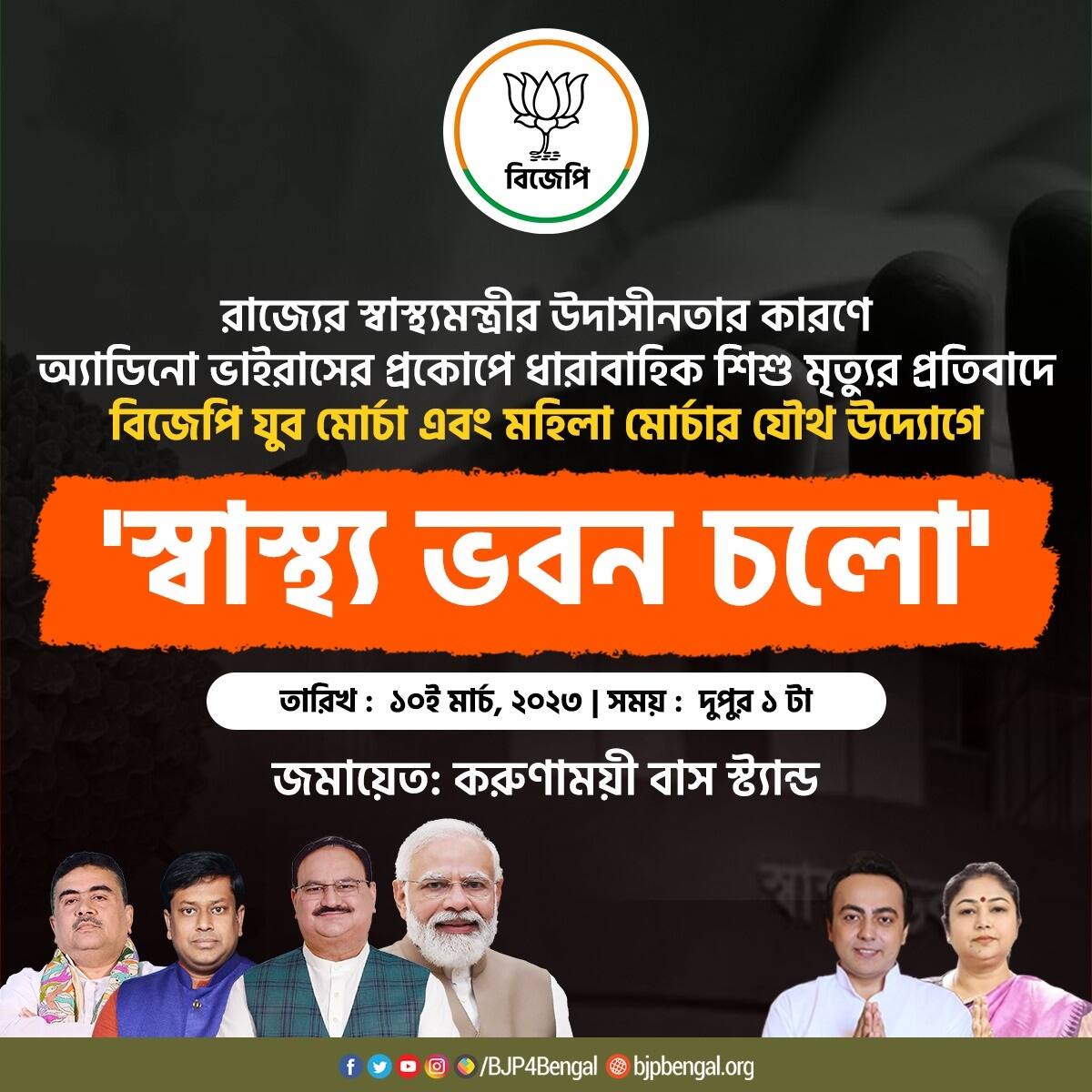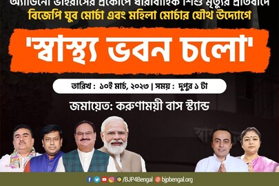 নেতৃত্ব দেবেন যুব মোর্চার রাজ্য সভাপতি ইন্দ্রনীল খাঁ। করুণাময়ী বাসস্ট্যান্ডে দুপুর একটায় জমায়েত। তারপর সেখান থেকেই সল্টলেকের স্বাস্থ্য ভবন অভিযান শুরু হবে। বিজেপি যুব মোর্চার এক প্রতিনিধি দলের অভিযান শেষে স্বাস্থ্য দফতরের কর্তাদের কাছে স্মারকলিপিও তুলে দেওয়ার পরিকল্পনা আছে। যুব মোর্চার রাজ্য সভাপতি ইন্দ্রনীল খাঁ বলেন, ‘‘স্বাস্থ্যমন্ত্রী তথা মুখ্যমন্ত্রীর উদাসীনতার কারণেই অ্যাডিনোভাইরাসের প্রকোপে শিশু মৃত্যুর ধারাবাহিকতা চলছে ৷ ’’