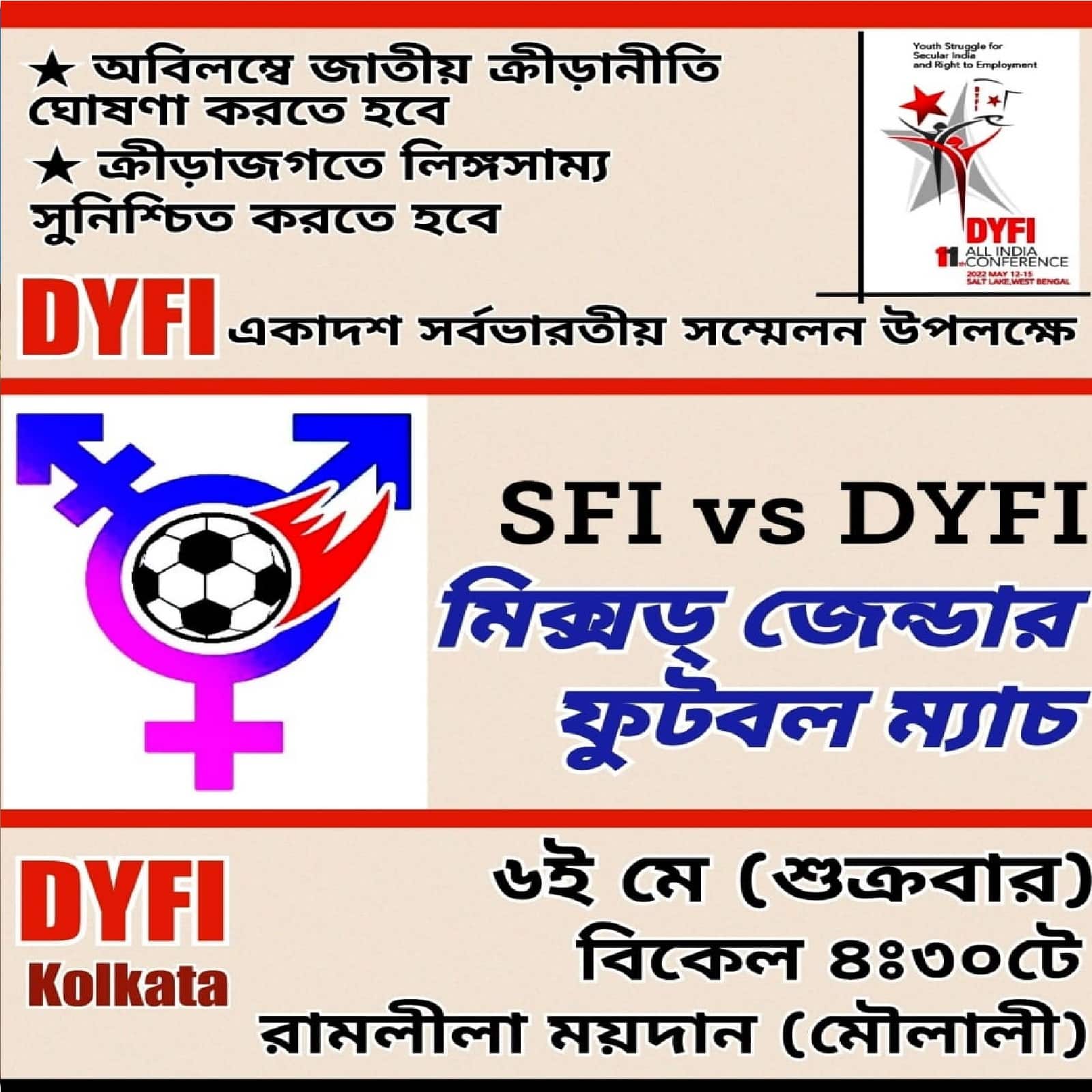 CPIM Gender Equality Match: শুক্রবার মৌলালির রামলীলা ময়দানে মুখোমুখি হতে চলেছে সিপিএমের ছাত্র-যুব সংগঠন এসএফআই-ডিওয়াইএফআই। দলের সর্বভারতীয় সম্মেলন উপলক্ষে এই ম্যাচের আয়োজন করেছে ডিওয়াইএফআই।