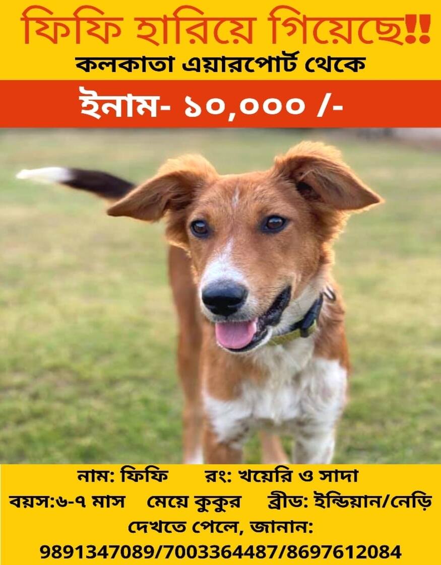 #কলকাতা: 'ফিফি হারিয়ে গিয়েছে', কলকাতা বিমানবন্দর সংলগ্ন এলাকায় গত কয়েকদিন ধরে এই পোস্টারটি সর্বত্র ছেয়ে গিয়েছে। দেশি কুকুরের ছবি দেওয়া ওই পোস্টারে 'ইনাম'ও ঘোষণা করা আছে। অর্থাৎ কেউ ফিফি'র সন্ধান দিতে পারলে আছে নগদ পুরস্কার। কিন্তু দশদিন পেরলেও এখনও ঘরে ফেরেনি ফিফি।