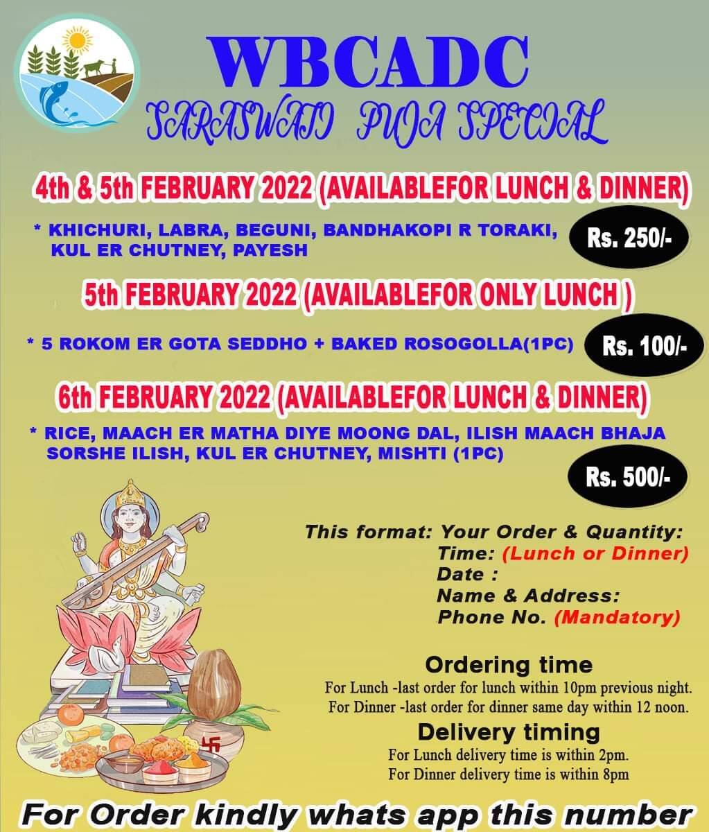 সরস্বতী পুজো স্পেশাল হিসাবে গতকাল ও আজ, শনিবার পাওয়া যাবে খিচুড়ি, লাবড়া, বেগুনি, বাঁধাকপির তরকারি, কুলের চাটনি ও পায়েস। দুপুর ও রাতের মেনুতে মিলবে এই খাবার। এর জন্যে খরচ করতে হবে মাত্র ২৫০ টাকা। অন্যদিকে আজ, শনিবার শুধু মাত্র দুপুরের জন্যে স্পেশ্যাল গোটা সেদ্ধ নেওয়া যাবে। ১০০ টাকা খরচ করলেই মিলবে, ৫ রকমের গোটা সেদ্ধ ও একটা বেকড রসগোল্লা। আগামিকাল, রবিবার অবশ্য দুপুর ও রাতের খাবারে থাকছে এলাহি আয়োজন। মেনুতে থাকছে, ভাত, মাছের মাথা দিয়ে মুগ ডাল, ইলিশ মাছ ভাজা, সর্ষে ইলিশ, কুলের চাটনি ও এক পিস মিষ্টি। তবে এর জন্যে খরচ করতে হবে ৫০০ টাকা। কী ভাবে মিলবে দুয়ারে সরস্বতী পূজার ভোগ? অর্ডার দিতে ফোন করতে হবে, ৯১৬৩১২৪৫৫৬, ৬২৯০২২৫৮৫৯,৮১৭০৮৮৭৭৯৪, ৭৯০৮৬১৭৪০৪ নম্বরে ৷
