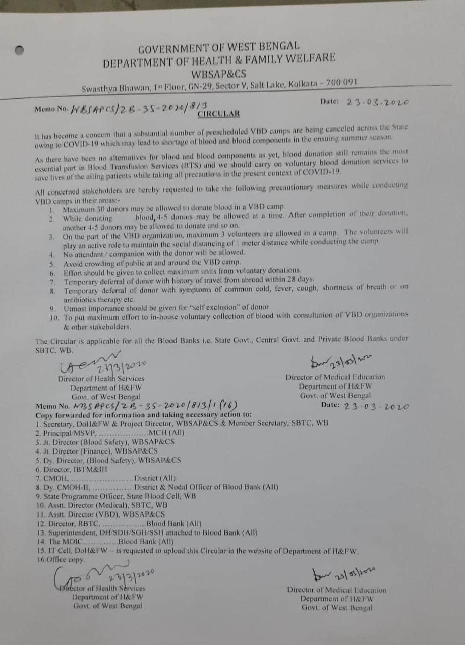 ৫.শিবিরে যেন বেশী জমায়েত না হয় । সঙ্কট মোকাবিলায় এহেন নির্দেশিকা কেন ? সূত্রের খবর রক্ত সংকটে ত্রাহি ত্রাহি অবস্থা সব জায়গায় । এদিকে প্রশাসন শিবির বাতিল করছে। সেই জায়গায় বহু স্বেচ্ছাসেবী সংগঠন স্বাস্থ্য দফতরকে জানায় বিষয়টি। রক্ত চাই আবার পরিস্থিতির প্রতি সম্মান জানিয়েই, তাই এই উদ্যোগ নিল স্বাস্থ্য দফতর ৷