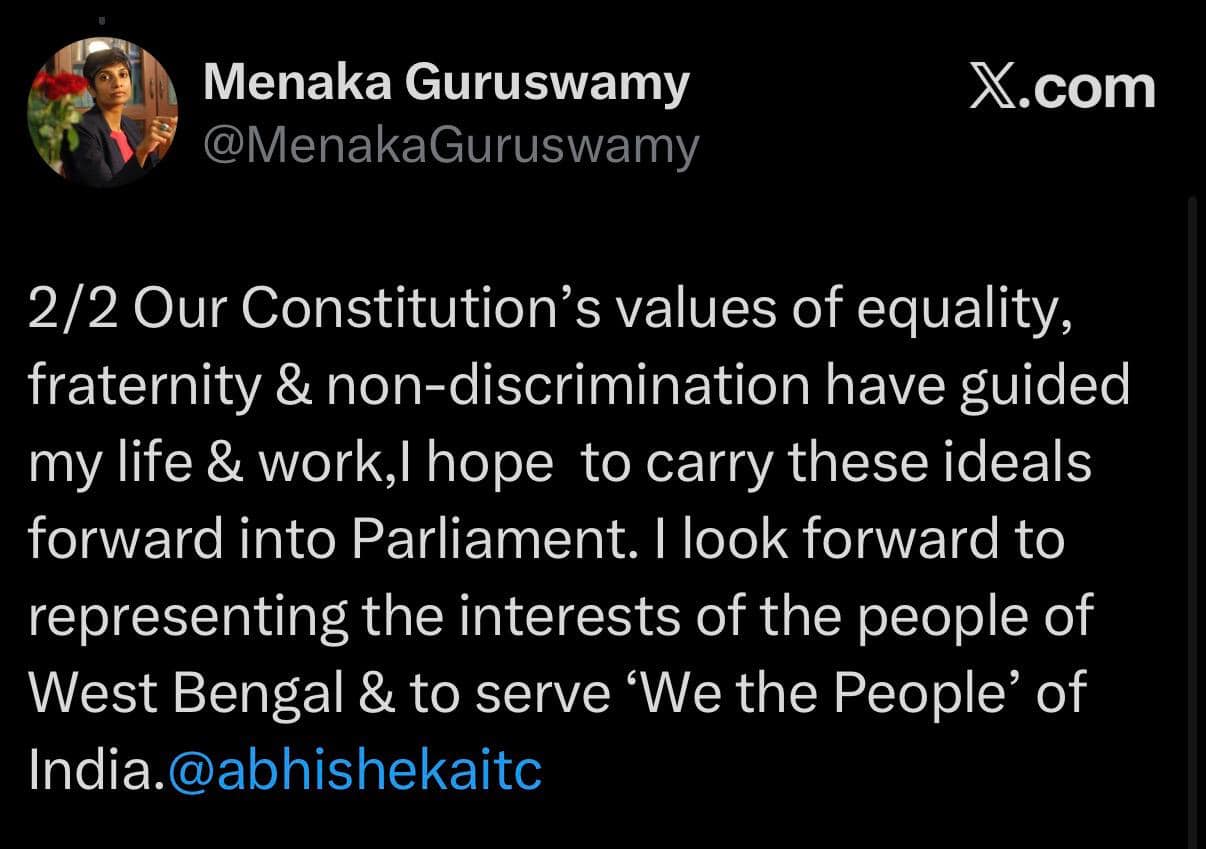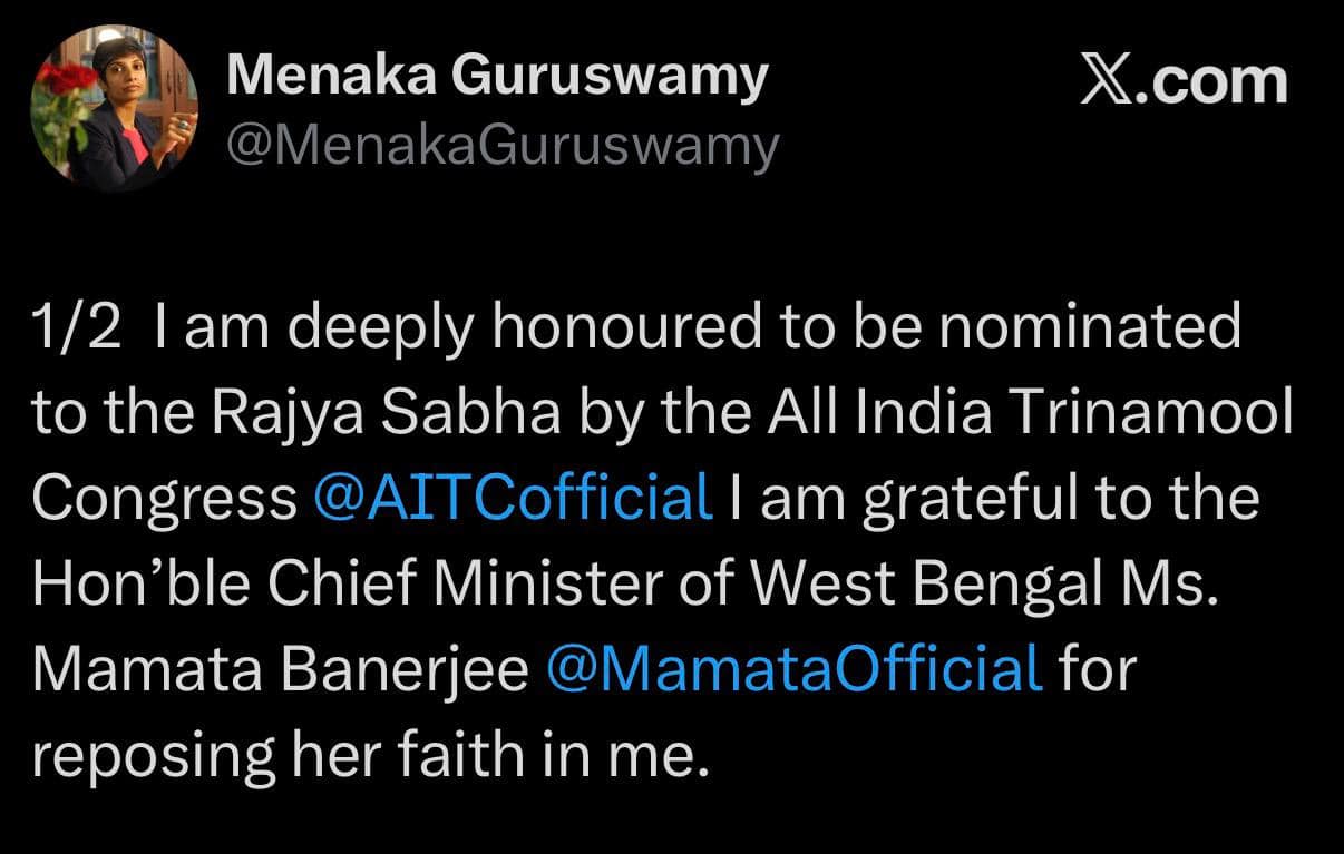 Menaka Guruswamy: 'সংসদে পশ্চিমবঙ্গের মানুষের প্রতিনিধি হব!' তৃণমূল রাজ্যসভায় মনোনীত করার পর প্রতিক্রিয়া মেনাকার
