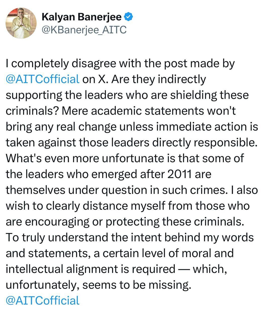 দলের বিবৃতির বিরুদ্ধে কার্যত নিজের ক্ষোভ উগরে দিয়ে কিছুক্ষণের মধ্যেই এক্স হ্যান্ডেলে পাল্টা পোস্ট করেন শ্রীরামপুরের তৃণমূল সাংসদ কল্যাণ বন্দ্যোপাধ্যায়৷