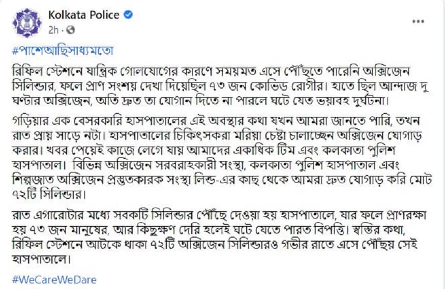 রাত এগারোটার মধ্যে সবকটি সিলিন্ডার পৌঁছে দেওয়া হয় হাসপাতালে, যার ফলে প্রাণরক্ষা হয় ৭৩ জন মানুষের, আর কিছুক্ষণ দেরি হলেই ঘটে যেতে পারত বিপত্তি। স্বস্তির কথা, রিফিল স্টেশনে আটকে থাকা ৭২টি অক্সিজেন সিলিন্ডারও গভীর রাতে এসে পৌঁছয় সেই হাসপাতালে। এই খবর আজ নিজেদের সোশ্যাল মিডিয়া পেজ অর্থাৎ ফেসবুকে জানায় কলকাতা পুলিশ। তাঁদের এই কাজকে কুর্নিশ জানিয়েছেন বহু মানুষ। কলকাতা পুলিশ ট্যাগে ব্যবহার করেছে 'পাশে আছি সাধ্যমতো।' এই বিপদের সময়ে ৭৩ জন রোগীর প্রাণ বাঁচিয়ে সত্যিই নজির গড়ল কলকাতা পুলিশ। প্রতিদিন হাজার হাজার মানুষ করোনা আক্রান্ত হচ্ছেন। হাসপাতালে বেড থেকে অক্সিজেনের অভাব দেখা দিচ্ছে। এই অবস্থায় একজন মানুষের প্রাণ বাঁচানোও কঠিন কাজ। সেই পরিস্থিতিতে এত দ্রুত অক্সিজেন সিলিন্ডার পৌঁছে দেওয়া সত্যিই প্রশংসনীয়।