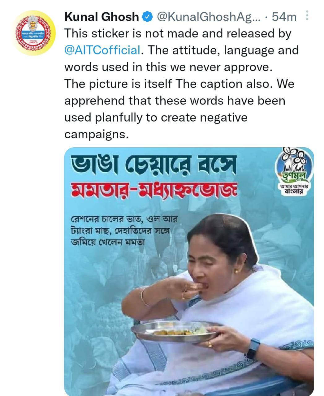 এরই সঙ্গে ডানদিকে জোড়াফুলের প্রতীক দেওয়া রয়েছে। তার নীচে লেখা " তৃণমূল, আমার, আপনার, বাংলার।" আর এই স্টিকার সোশ্যাল মিডিয়ায় পোস্ট হতেই তীব্র প্রতিক্রিয়া জানিয়েছে তৃণমূল কংগ্রেস। দলের মুখপাত্র কুণাল ঘোষ জানিয়েছেন, " এই স্টিকার তৈরি ও প্রকাশ কোনওটাই তৃণমূল কংগ্রেস করেনি। যে ভাষা ব্যবহার করা হয়েছে তা দল অনুমোদন দেয় না। যে ছবি ও ক্যাপশন দেওয়া হয়েছে তাও দল অনুমোদন করে না। আমরা মনে করি এটা আসলে পরিকল্পনা করে নঞর্থক প্রচারের উদ্দেশ্য পরিকল্পনা করে করা হয়েছে।" যদিও মমতা বন্দ্যোপাধ্যায়ের গ্রামের বাড়িতে বসে এই খাওয়ার ছবি সোশ্যাল মিডিয়ায় ঘুরছে। আর এই পোস্টার বা স্টিকারও প্রকাশিত হয়েছে। দলের তরফে গোটা বিষয়ে ষড়যন্ত্রের ইঙ্গিত দেওয়া হয়েছে।