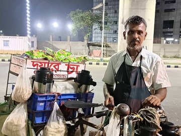 কিন্তু হাসি মুখে বলেন, "এখন আমার ভালই চলে। কোনও অভাব নেই।" মধ্যবিত্তের কাছে যে বাক্যের কোনও অস্তিত্বই নেই। লোকটির নাম মহম্মদ জাহাঙ্গির আলি। বয়স ৪০-এর শেষের দিকে হবে। বিকেল ৪টে থেকে ভোর ৫টা পর্যন্ত নিউটাউন চত্বরে তাঁর খোঁজ মিলবে। সাইকেলের রিং শোনা যাবে 'দুয়ারে চা'-এর।