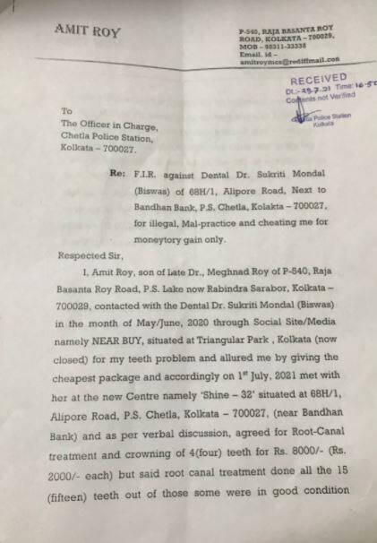 #কলকাতা: এবার চেতলা থানায় (Chetla Police Station) এক দাঁতের চিকিৎসক (Dental treatment) ও ডেন্টাল ক্লিনিকের (Dental clinic) বিরুদ্ধে চিকিৎসায় গাফিলতির অভিযোগ দায়ের। অভিযোগ অস্বীকার করেছেন ওই চিকিৎসক ও ক্লিনিক। তাঁদের পাল্টা অভিযোগ চিকিৎসা করিয়ে বাকি টাকা না দিতেই মিথ্যা অভিযোগ করছেন অভিযোগকারী।রাজা বসন্ত রায় রোডের বাসিন্দা অমিত রায় ওই চিকিৎসকের বিরুদ্ধে চিকিৎসায় গাফিলতির অভিযোগ করেছেন।দাঁতের সমস্যা নিয়ে আলিপুর রোডের এক ডেন্টাল ক্লিনিকে যান অমিত বাবু। তাঁর অভিযোগ, তিনি চারটি দাঁতের আরসিটি বা রুট চ্যানেল ট্রিটমেন্ট করার কথা বলেন চিকিৎসককে। কিন্তু অপারেশন করার সময় অমিত বাবুকে না জানিয়ে ১৫টি দাঁতের আরসিটি করা হয়েছে। শুধু তাই নয় কিছু ভালও দাঁতও নষ্ট করে দেওয়ার অভিযোগ এনেছেন অমিত রায়।