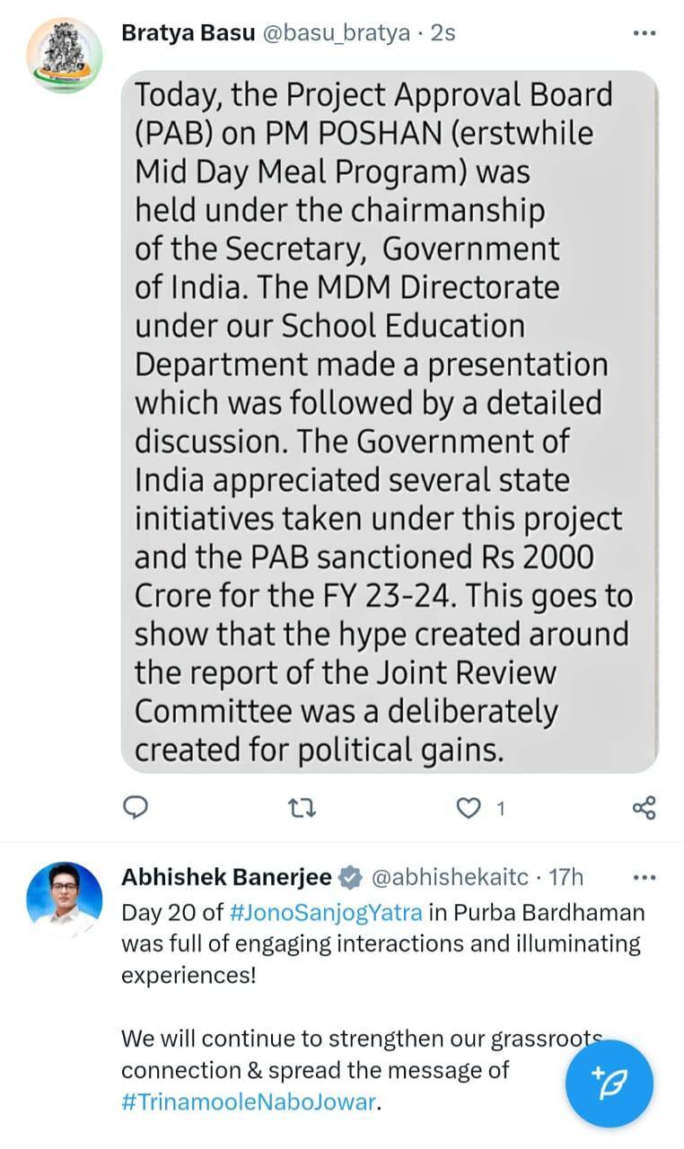 শুধু তাই নয় মিড ডে মিল নিয়ে সম্প্রতি জয়েন্ট রিভিউ মিশন যে রিপোর্ট জমা দিয়েছে তা নিয়েও এদিন তাঁর ট্যুইটে কটাক্ষ করেন শিক্ষামন্ত্রী। রাজনৈতিকভাবে যে ওই রিপোর্ট তৈরি হয়েছে তাও তিনি তাঁর ট্যুইটে ইঙ্গিত দেন ফের। প্রসঙ্গত ২০২২ -২৩ অর্থ বর্ষের মিড ডে মিলের বরাদ্দ ইতিমধ্যেই দিয়েছে কেন্দ্র রাজ্যকে। প্রসঙ্গত সম্প্রতি জয়েন্ট রিভিউ মিশনের অধীনে সদস্যরা রাজ্যে পরিদর্শন আসে মিড ডে মিল প্রকল্প নিয়ে। পরিদর্শন শেষে তারা কেন্দ্রর কাছে রিপোর্ট জমা দেয়।
