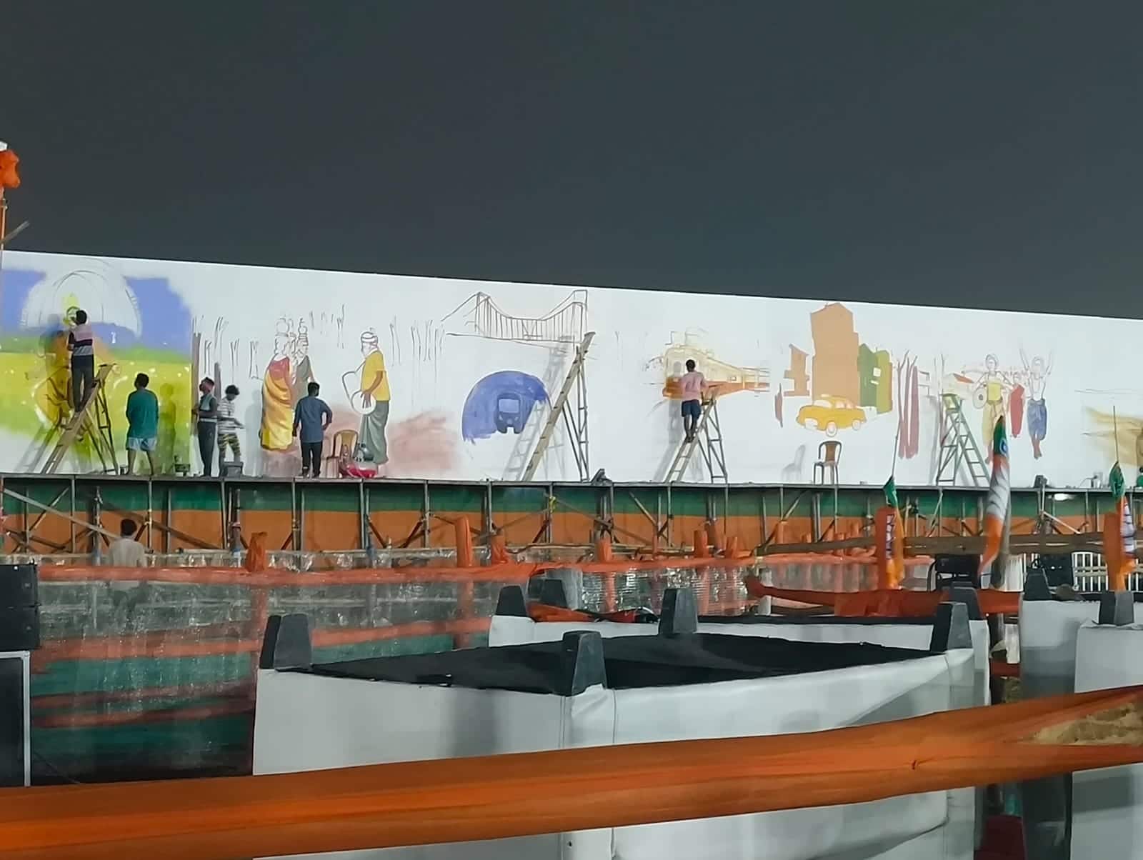 শেষ মুহূর্তের প্রস্তুতি তুঙ্গে। শুধু জনসমাগম নয়, সভার মঞ্চসজ্জাতেও বিশেষ গুরুত্ব দিচ্ছে বিজেপি। হিন্দুত্বের বার্তা এবং বাঙালির সাংস্কৃতিক আবেগ—এই দুইকে একসঙ্গে তুলে ধরতেই মঞ্চের নকশায় রাখা হয়েছে বিশেষ ভাবনা।আয়োজক সূত্রে জানা গিয়েছে, সভার মূল মঞ্চটি তৈরি করা হচ্ছে দক্ষিণেশ্বর মন্দিরের আদলে। বাংলার অন্যতম ঐতিহাসিক ও ধর্মীয় স্থাপত্যের ছাপ তুলে ধরতেই এই নকশা বেছে নেওয়া হয়েছে। মঞ্চের দু’পাশে বাংলার ঐতিহ্য ও সংস্কৃতির বিভিন্ন প্রতীক তুলে ধরা হবে।