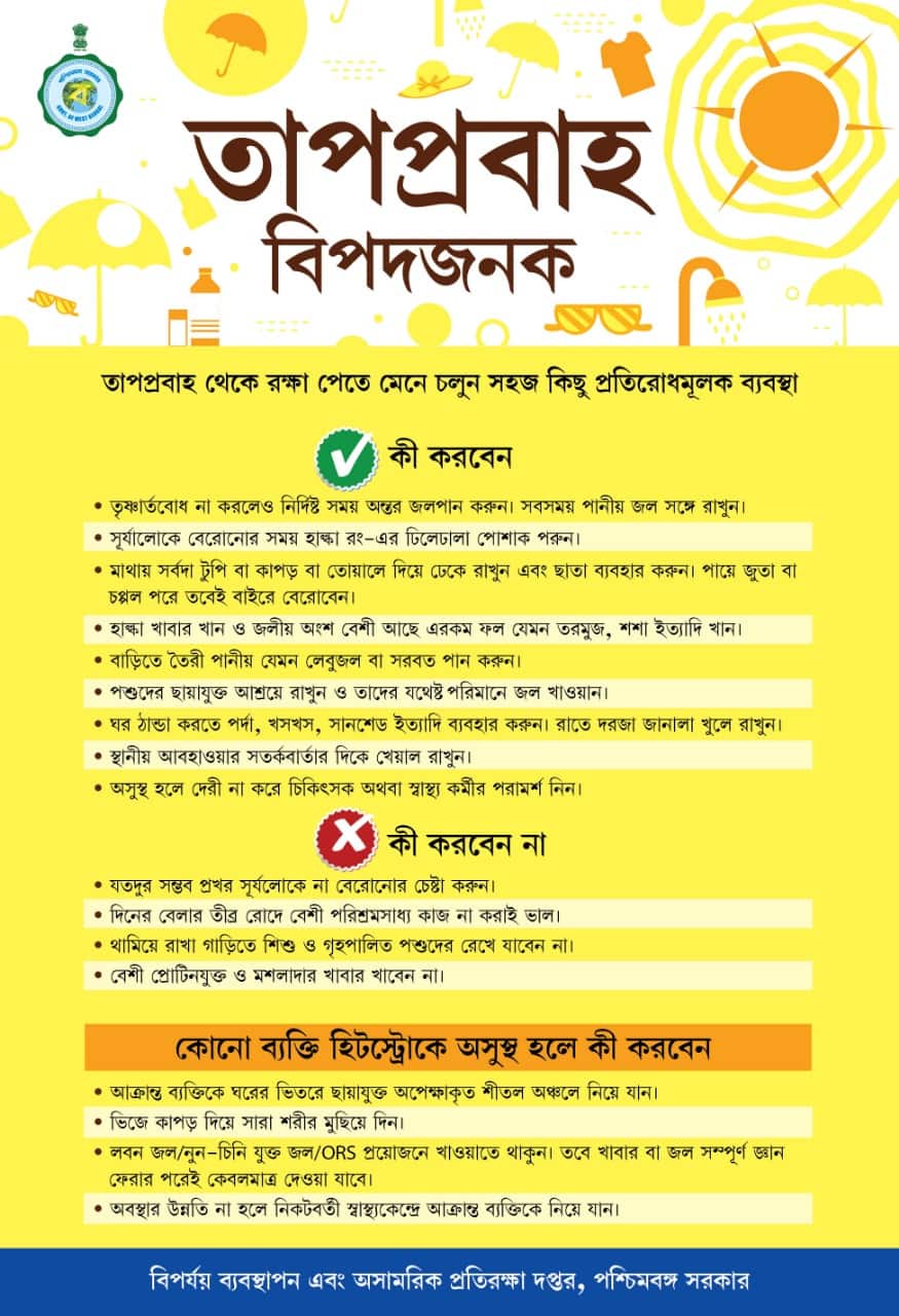 তাপপ্রবাহ পরিস্থিতি থেকে বাঁচতে কী করণীয়, কী করণীয় নয়, তার উল্লেখ করে রাজ্য সরকারের তরফে লিফলেটও ছাপানো হয়েছে৷