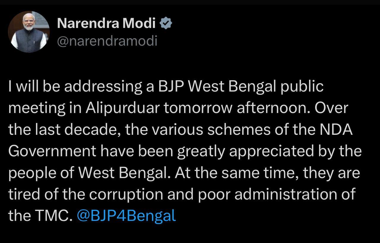 এদিন মোদি তাঁর সোশ্যাল মিডিয়া পোস্টে লেখেন, ‘আগামিকাল দুপুরে আমি পশ্চিমবঙ্গের বিজেপি জনসভায় উপস্থিত থাকব৷ গত এক দশক ধরে কেন্দ্রের এনডিএ সরকারের নানা প্রকল্প পশ্চিমবঙ্গের সাধারণ মানুষের ভাল লেগেছে৷ একইসঙ্গে, তাঁরা তৃণমূলের দুর্নীতিগ্রস্ত এবং অক্ষম প্রশাসন নিয়েও বিরক্ত এবং ক্লান্ত৷’ আসার আগেই মমতা বন্দ্যোপাধ্যায়ের সরকারকে আক্রমণ করলেন মোদি, মঞ্চ থেকে তিনি কোন কোন বিষয় নিয়ে কথা বলেন, তা অবশ্য আগামিকালই বোঝা যাবে৷