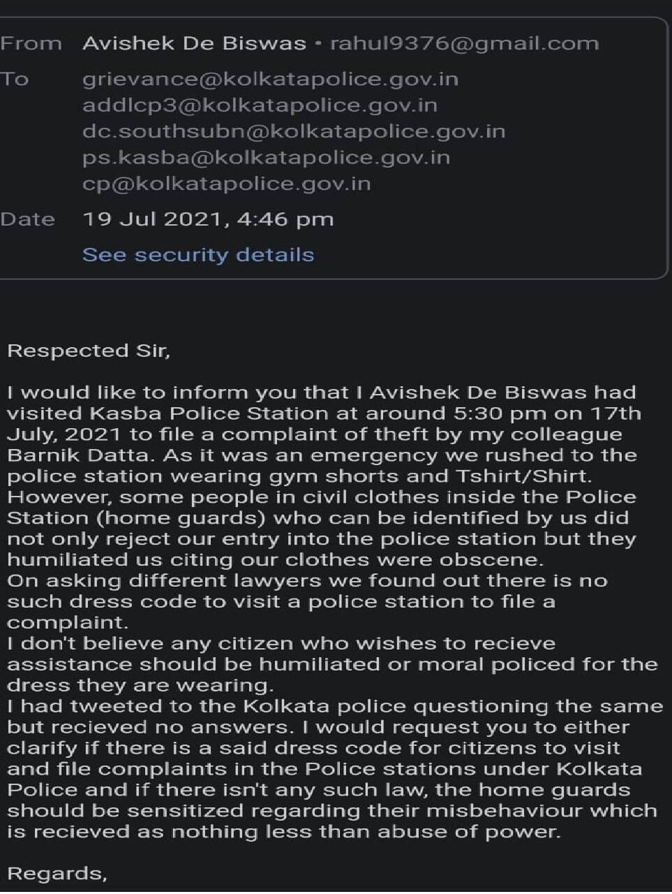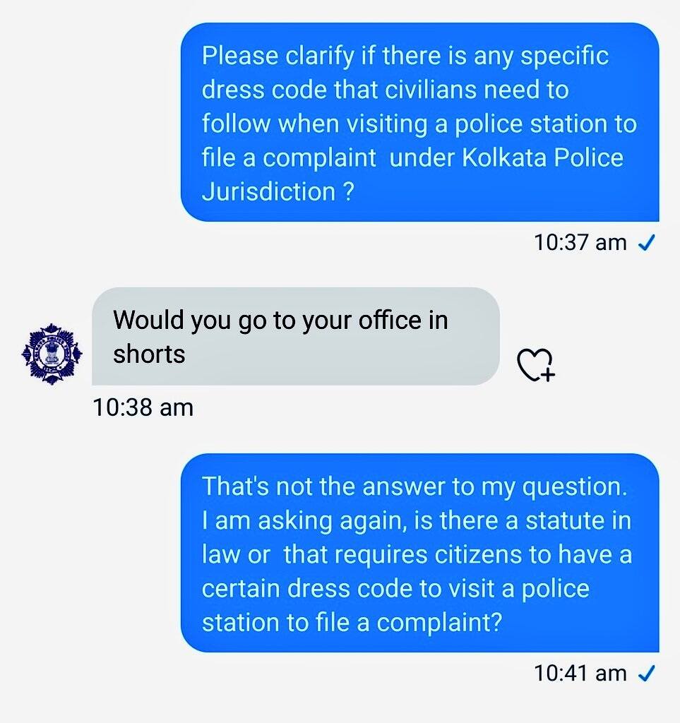কিন্তু একজন নাগরিক হিসেবে তাঁর প্রশ্ন তাহলে কি থানাতে অভিযোগ জানাতে আসার কোনও ড্রেস কোডের নিদান আছে? নিজের প্রশ্নের উত্তর পেতে বার্ণিক দত্ত ও তার বন্ধু অভিষেক দে বিশ্বাস কলকাতা পুলিশের উচ্চপদস্থ আধিকারিককে মেল করেন। শুধু তাই নয় ট্যুইটার হ্যান্ডলে মেসেজ করে জানতে চান 'হাফ প্যান্ট পরে কি থানায় অভিযোগ জানাতে আসা নিষেধ?' একই সঙ্গে কসবা থানার বিষয়টিও তুলে ধরা হয়। যার উত্তরে কলকাতা পুলিশের তরফে মেসেজ করে বলা হয়, 'অফিসে কী হাফ প্যান্ট পরে যান?