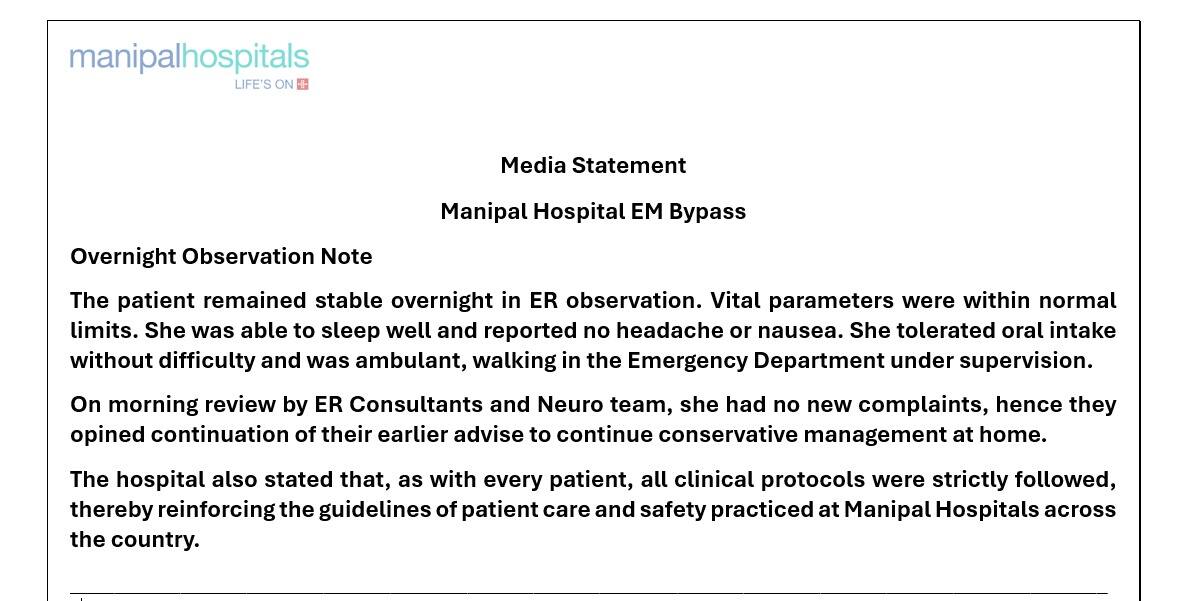 জরুরি বিভাগ ও স্নায়ুরোগ বিশেষজ্ঞ চিকিৎসকরা আজও পুঙ্খানুপুঙ্খ পরীক্ষা করে জানিয়েছেন— নতুন করে কোনও সমস্যা নেই। তাকে বাড়িতে বিশ্রামে থাকার পরামর্শ দেওয়া হয়েছে। প্রতিটি রোগীর মতোই, এই রোগীর ক্ষেত্রেও সমস্ত চিকিৎসা প্রোটোকল, গাইডলাইন ও নিরাপত্তা মেনে পরিষেবা দেওয়া হয়েছে।