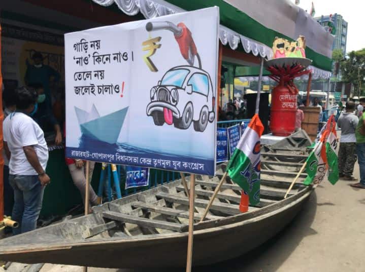 #কলকাতা: পেট্রোপণ্যের মূল্যবৃদ্ধির (Petrol price hike) প্রতিবাদে রবিবারও তৃণমূল কংগ্রেসের তরফে ধরনা কর্মসূচি অনুষ্ঠিত হল। দু’দিনের এই ধরনা কর্মসূচিতে অভিনব প্রতিবাদের দেখা মিলল রাজারহাট গোপালপুর বিধানসভার (Rajarhat Gopalpur) অন্তর্গত বাগুইআটি (Baguiati more) মোড়ে।প্রতিদিনই বাড়ছে পেট্রল-ডিজেলের দাম। যারই প্রতিবাদে রাস্তায় নৌকো নামিয়ে অভিনব প্রতিবাদে সামিল স্থানীয় তৃণমূল নেতৃত্ব। উপস্থিত ছিলেন এলাকার বিধায়ক অদিতি মুন্সি (MLA Aditi Munshi)। তিনি কেন্দ্রীয় সরকারের বিরুদ্ধে সোচ্চার হয়ে পেট্রোপণ্যের দাম বৃদ্ধির প্রতিবাদ করেন।