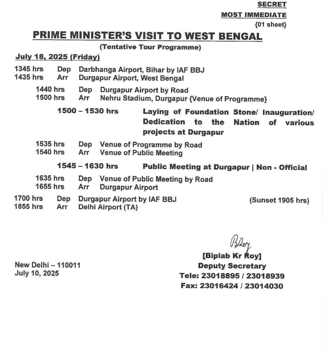 রাজনৈতিক শিবিরের ধারণা ২৬-এর বিধানসভা নির্বাচনকে সামনে রেখে দলীয় সাংগঠনকে শক্তিশালী করা ও ২০২৬ সালের বিধানসভা নির্বাচনকে সামনে রেখে প্রস্তুতির বার্তা দেওয়ার লক্ষ্যেই মোদির এই বঙ্গ সফর। বিজেপি সূত্রে প্রধানমন্ত্রীর সফরের নির্ঘণ্ট প্রকাশ করে জানানো হয়েছে, আগামী শুক্রবার বেলা ১,৪৫ এর বিমানে বিহারের দারভাঙা বিমানবন্দর থেকে দুর্গাপুরের উদ্দেশ্যে রওনা দেবেন তিনি। বেলা ২,৪৫ নাগাদ দুর্গাপুরের অন্ডাল বিমানবন্দরে নেমে সেখান থেকে সড়কপথে পরবর্তী সরকারি প্রোগ্রামের উদ্দেশ্যে রওনা দেবেন প্রধানমন্ত্রী।