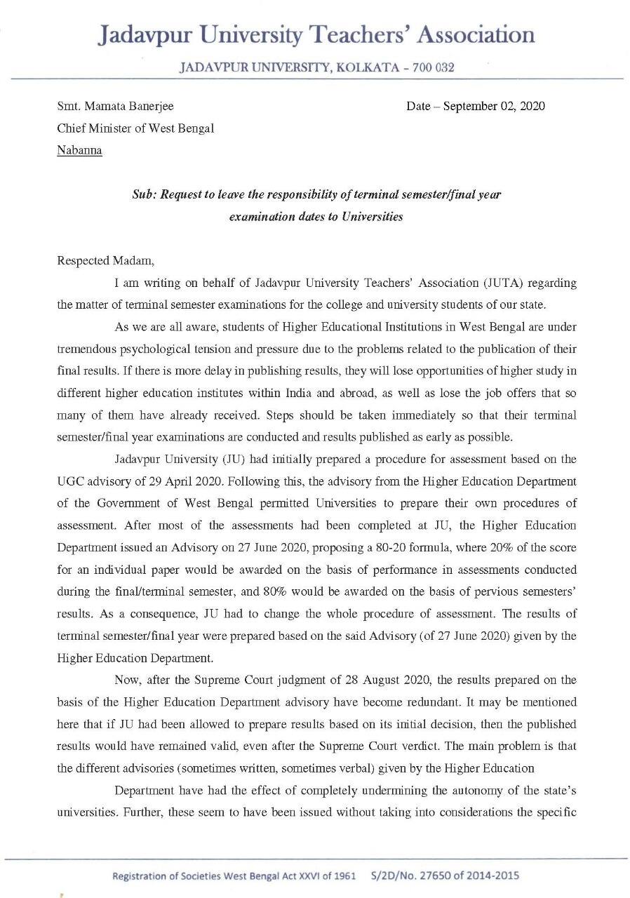 বৈঠকে উপাচার্যদের বলা হয়েছে ১ অক্টোবর থেকে ১৮ অক্টোবর পর্যন্ত পরীক্ষা নিতে হবে ও ৩১ শে অক্টোবরের মধ্যে ফল প্রকাশ করতে হবে। আর এবার যাদবপুর বিশ্ববিদ্যালয় অধ্যাপক সংগঠন বা জুটা পরীক্ষার দিন কোন ফল প্রকাশ নিয়ে বিশ্ববিদ্যালয়গুলোকে স্ব-শাসন দেওয়ার পক্ষেই সওয়াল করল। মুখ্যমন্ত্রী মমতা বন্দ্যোপাধ্যায়কে চিঠি পাঠিয়ে বিশ্ববিদ্যালয়ের অধ্যাপক সংগঠনের আবেদন কবে পরীক্ষা নেওয়া হবে এবং কবে ফল প্রকাশ করতে হবে তা যেন বিশ্ববিদ্যালয়গুলির উপরে ছেড়ে দেওয়া হয়। সরকারের তরফে নির্ধারিত সময়সীমার মধ্যে পরীক্ষা নিলেও ফল প্রকাশ করা কার্যত অসম্ভব এদিন চিঠিতে তারা জানিয়েছে অধ্যাপক সংগঠন জুটা।