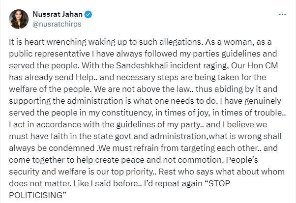 এদিন সাবেক টুইটার, বর্তমানে ‘X’-এ একটি পোস্ট করেন তৃণমূল সাংসদ তথা অভিনেত্রী নুসরত জাহান। সেখানে তিনি লেখেন, ‘এই ধরনের অভিযোগ হৃদয় বিদারক৷ একজন মহিলা হিসাবে, একদন জনপ্রতিনিধি হিসাবে আমি সবসময় আমার দলের গাইডলাইন মেনে কাজ করেছি৷ সন্দেশখালিতে যে ঘটনা ঘটছে, আমাদের মাননীয়া মুখ্যমন্ত্রী সেখানে সাহায্য পাঠিয়েছেন..মানুষের ভালর জন্য বিভিন্ন ধরনের পদক্ষেপ করা হচ্ছে৷ আমরা আইনের ঊর্ধ্বে নই৷ সেই কারণে আইন মেনেই আমরা যা করণীয়, তাতে প্রশাসনকে সাহায্য করছি৷’