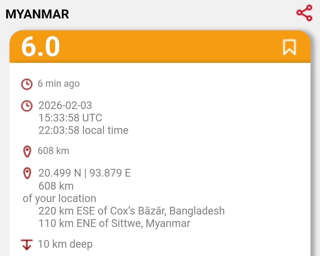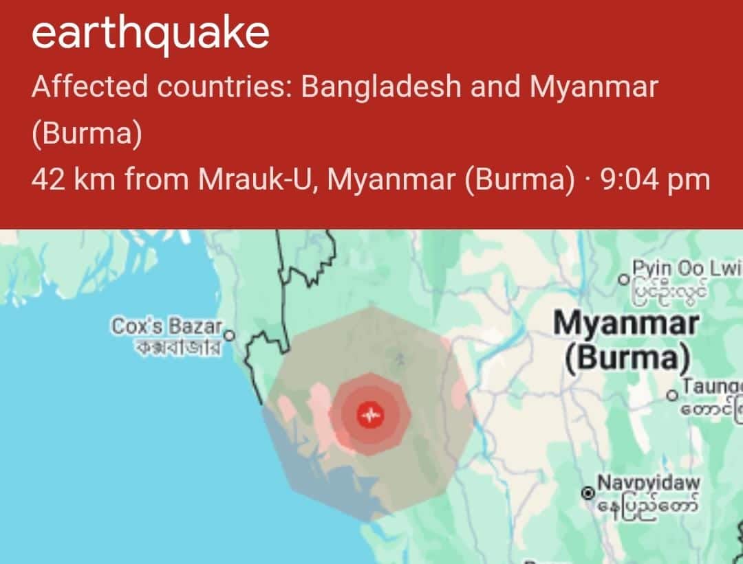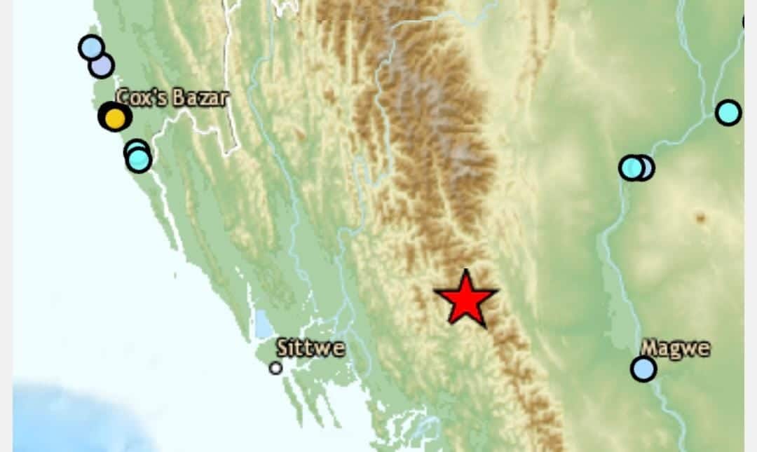আজ দুপুরেও মায়ানমারে ভূমিকম্প হয় তবে সেটা সিটে থেকে একটু দূরে মান্ডালায়। তীব্রতা ছিল ৪.২।